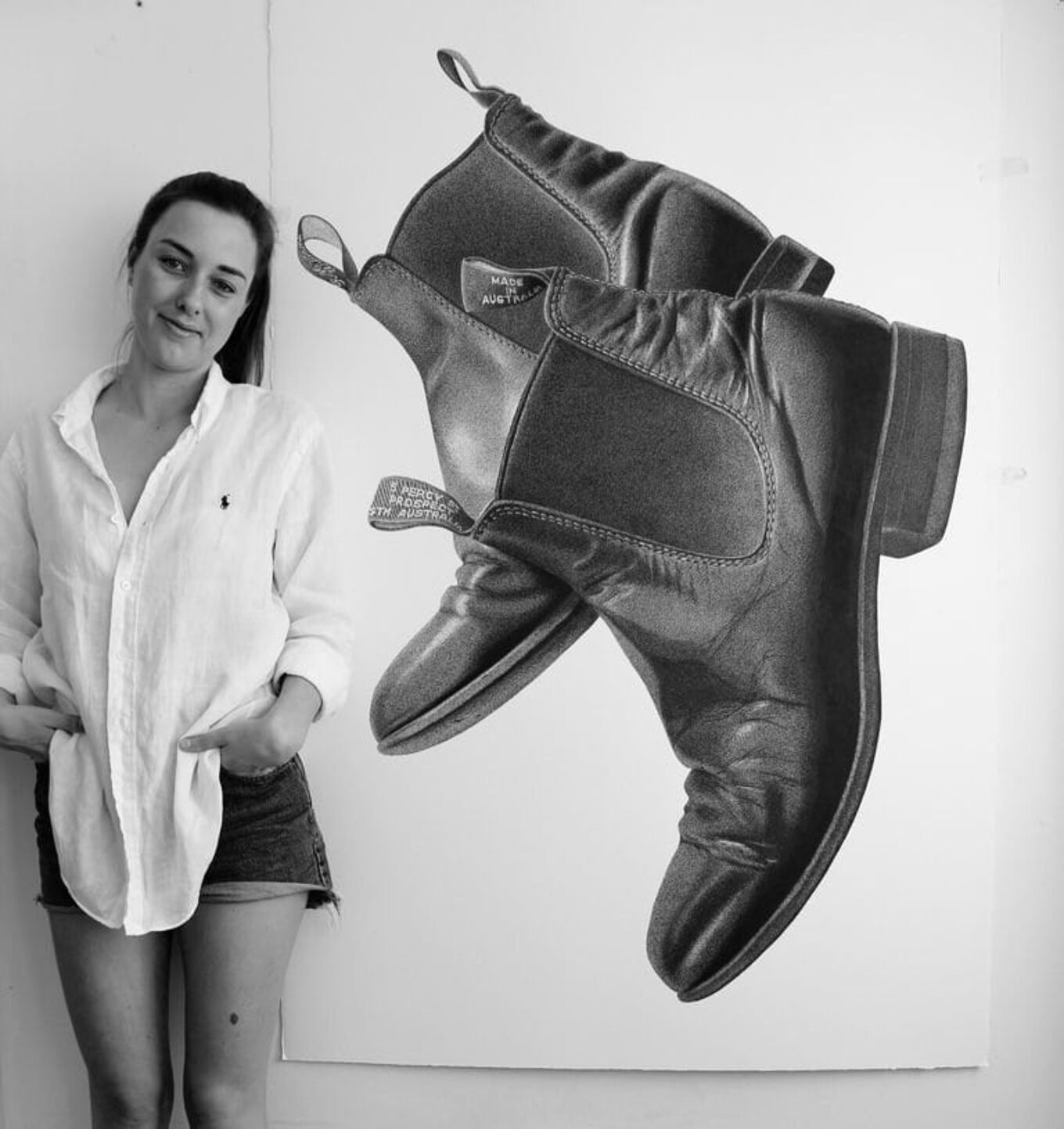 Cj Hendry на фоне своей работы с изображением ботинок RM Williams, выполненным черной ручкой. Это первый рисунок, проданный художницей через инстаграм. Прайс – $10 000. Фото Instagram cj_hendry