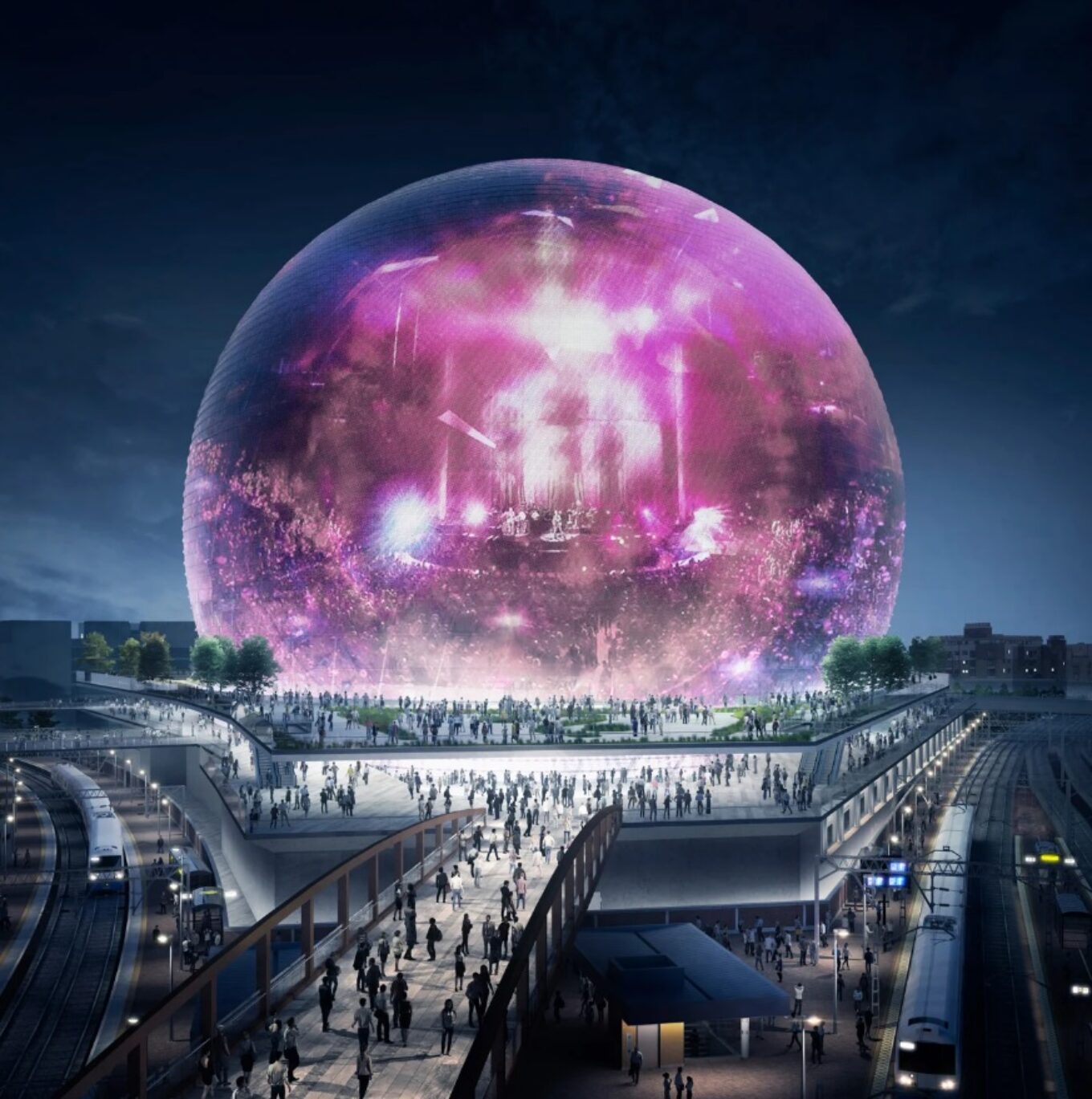 MSG Sphere розташують на трикутній ділянці, яка з усіх боків оточена залізничними коліями. Її умовним фундаментом стане попередньо зведена будівля-подіум із магазинами та нічним клубом.