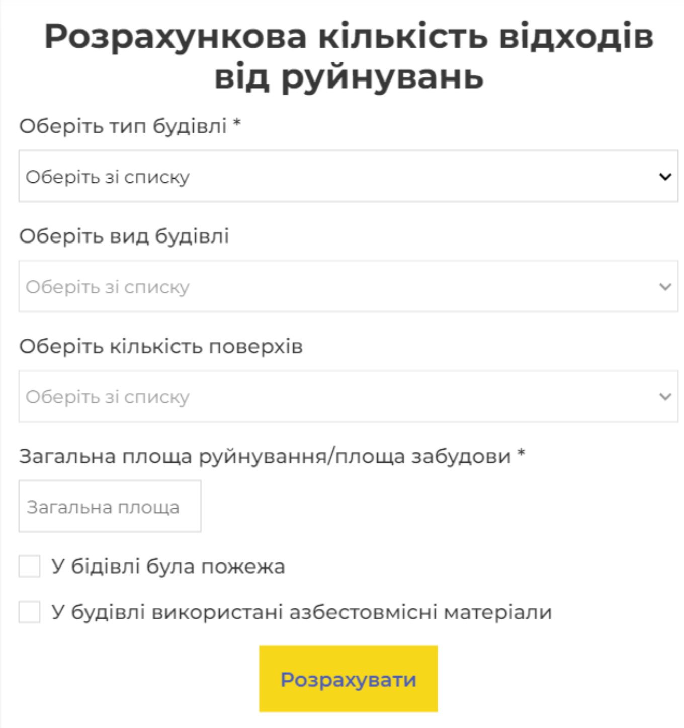 Функціонал калькулятора дозволяє оцінити кількість утворених відходів від руйнувань: загальну та за окремими компонентами (як то бетон, цегла, метал, дерево, супутні відходи тощо) на основі лише двох показників: типу будівлі та площі забудови або руйнування.