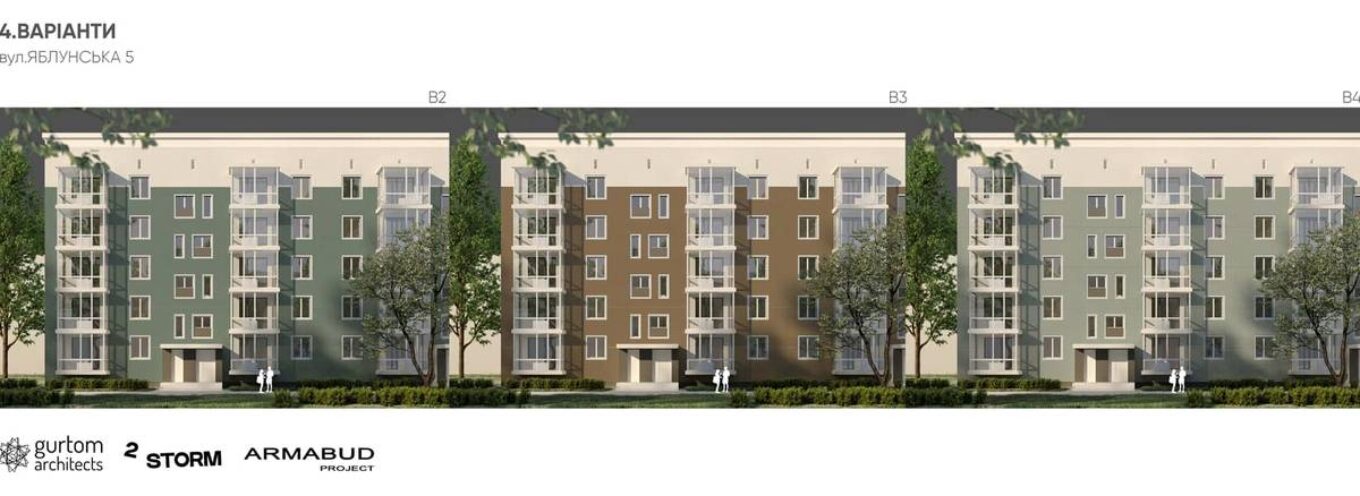 Усі складові фасаду будинків (вікна, балкони, вхідні групи, кондиціонери тощо) мають кілька варіантів виконання. Це ж стосується утеплювача, кольору та рельєфу тинькування тощо.