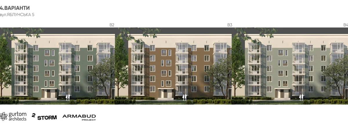 Усі складові фасаду будинків (вікна, балкони, вхідні групи, кондиціонери тощо) мають кілька варіантів виконання. Це ж стосується утеплювача, кольору та рельєфу тинькування тощо.