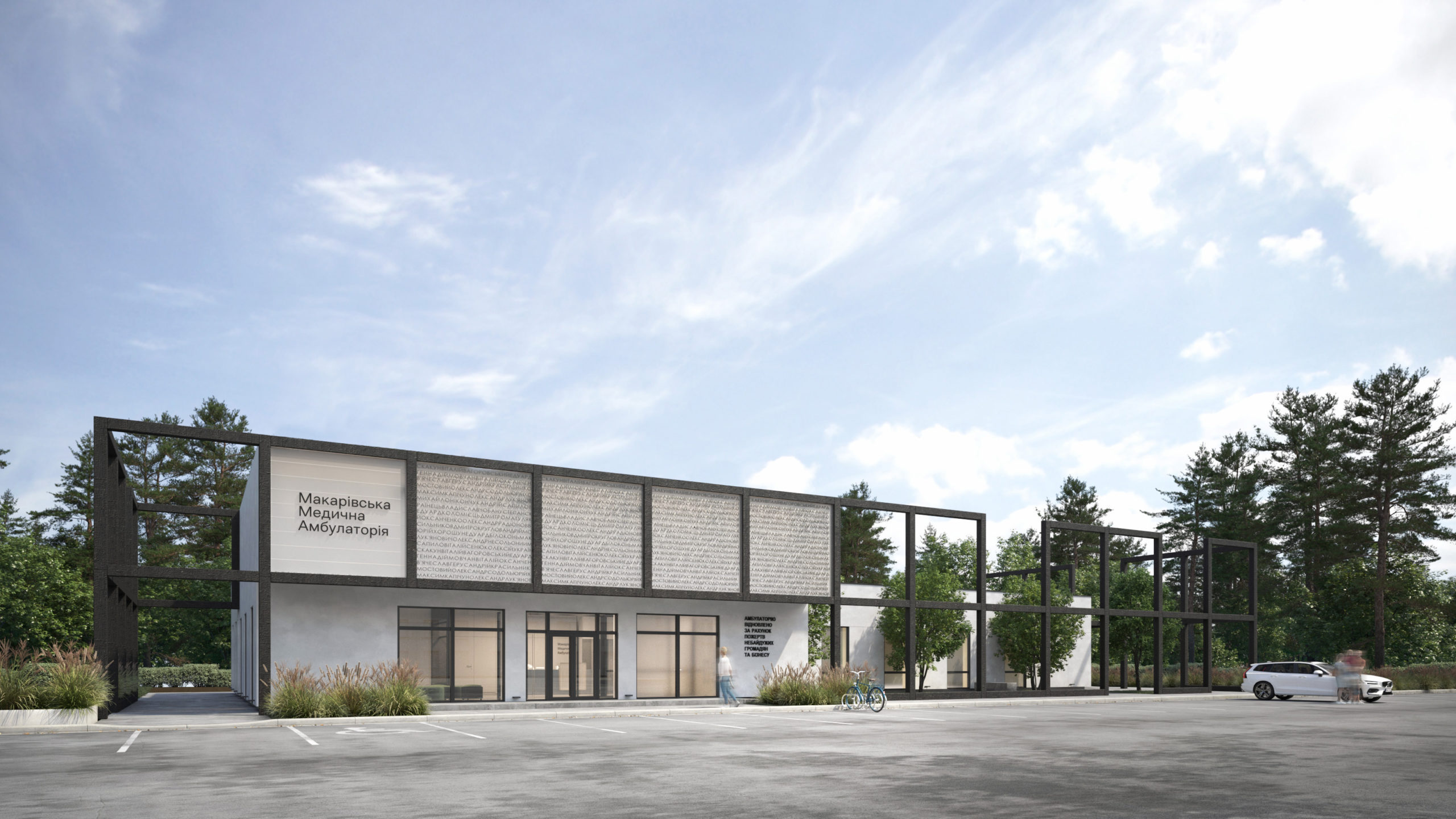 Концепт відновлення медичної амбулаторії в селищі Макарів під Києвом. Стара будівля була зруйнована прямим влучанням російської ракети в березні минулого року. Візуалізації Bogdanova bureau