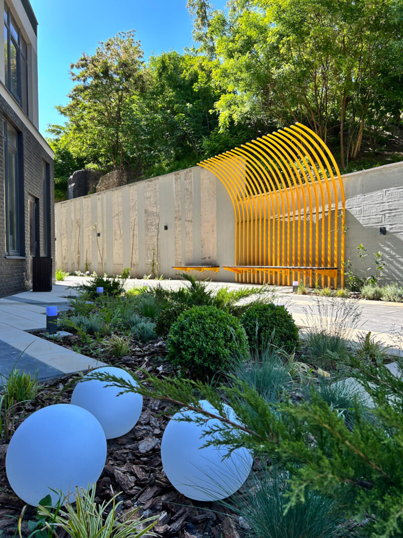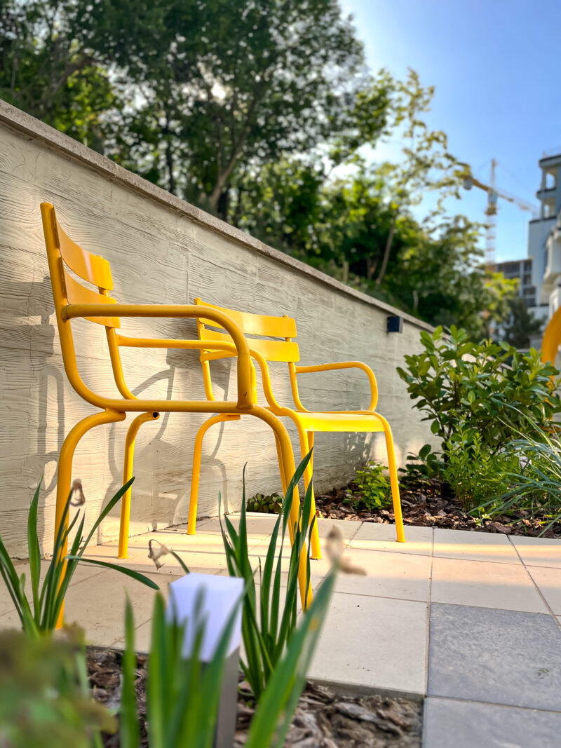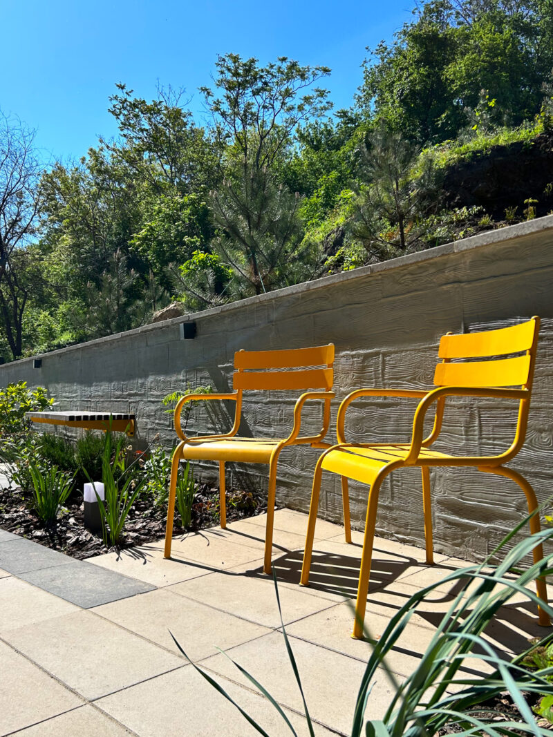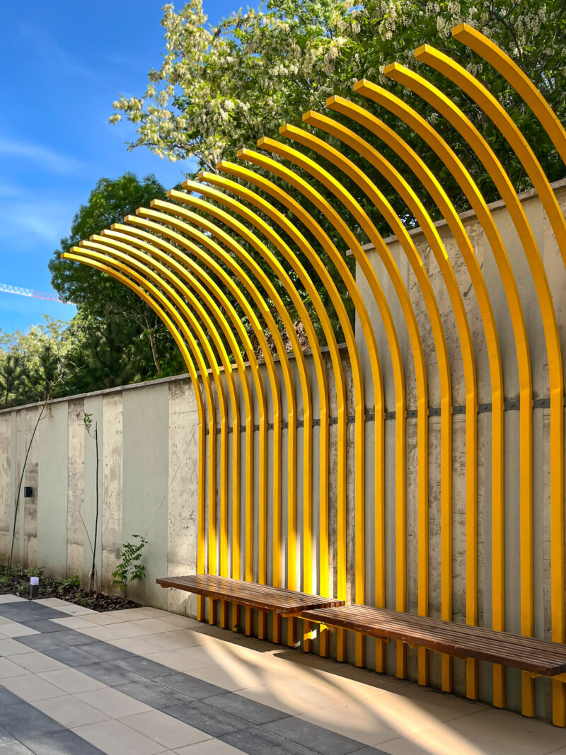 Через брак простору архітектори вирішили максимально обіграти стіну, і тому освітлення, перголи та лави спроєктували й розмістили прямо на ній. Висока підпірна стінка з одного боку та 7 поверхів будинку з іншого створюють так зване відчуття тунелю. Вони дають тінь на більшу частину ділянки, тому треба було розбавити стіну фарбами, аби візуально полегшити територію. Для МАФів обрали акцентний і сонячний жовтий колір. Окремої уваги заслуговують металеві жовті стільці, натхненням для яких став паризький сад Тюїльрі.