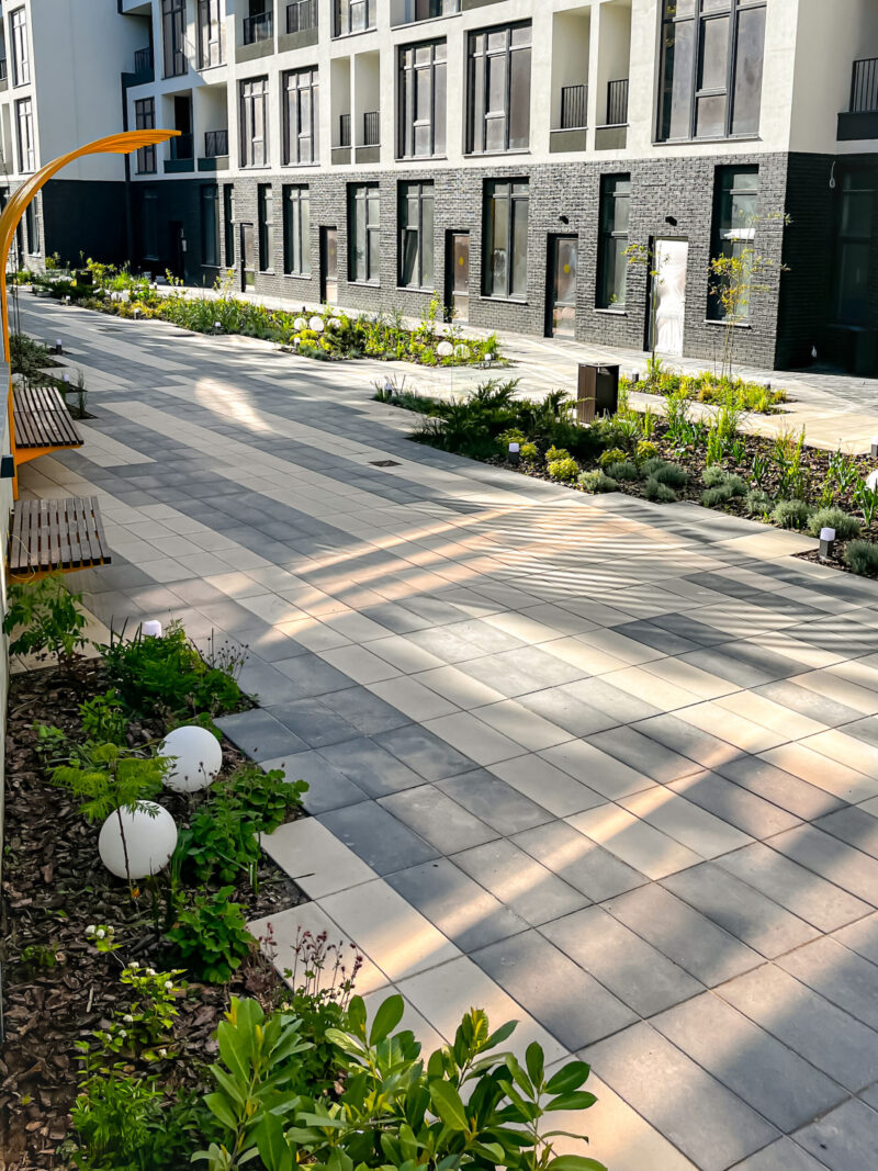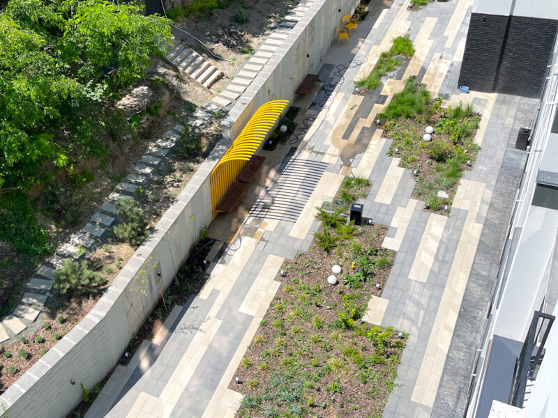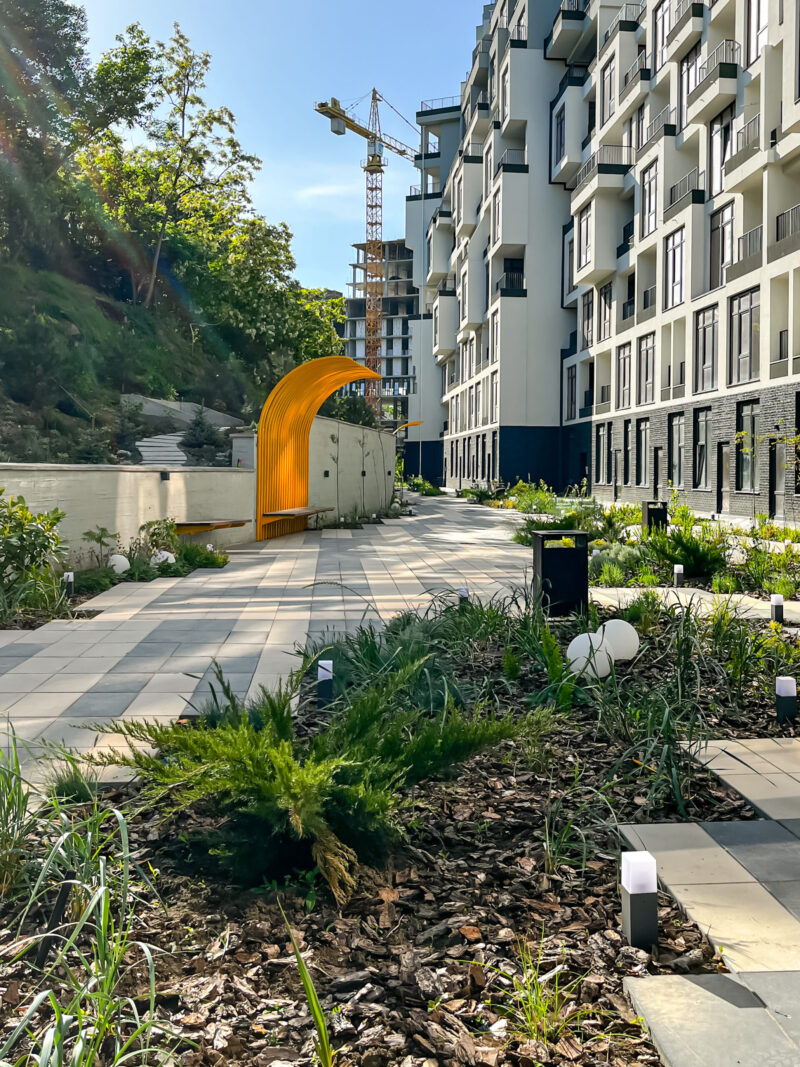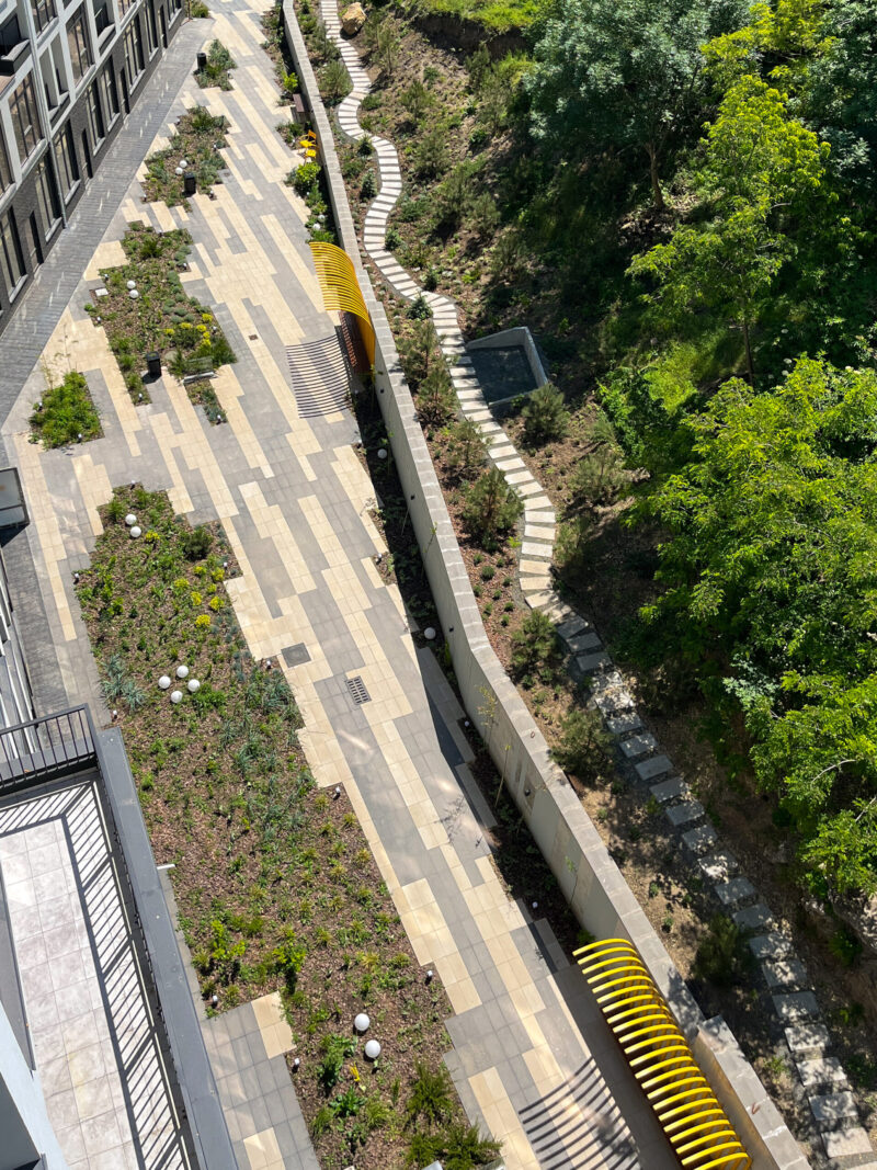 «Отже, в нас було дві головні задачі — зонувати мешканців від транзиту і розмістити на дуже вузькій території практики для їх відпочинку та дозвілля. Ми розробили унікальну геометрію мощення та клумб, якими ми прикрили входи до парадних, і висадили міскантуси, що створять затишну кулісу і відділять приватну зону від громадської, тобто транзиту з ТЦ до парку», – зазначають у Bee Landscaping Bureau.