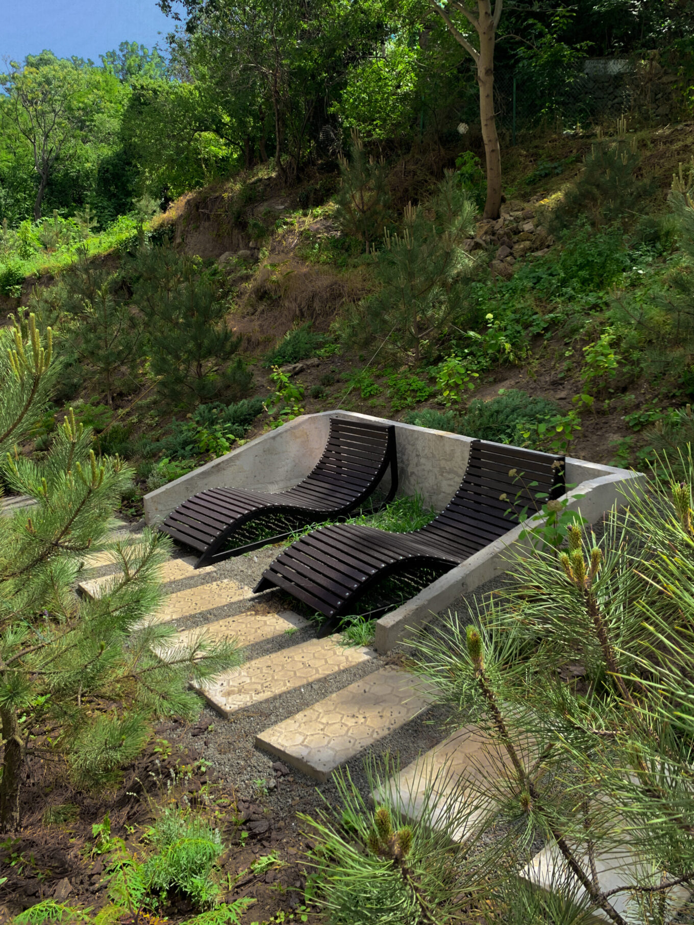 Бонусом до основної території додалась територія схилу за підпірною стінкою. На ній спроєктували «Зону інтроверта» — прогулянкову доріжку між соснами та квітниками. А для особливих поціновувачів розроблені два майданчики у тіні під деревʼяні шезлонги, аби можна було усамітнитися з книгою.