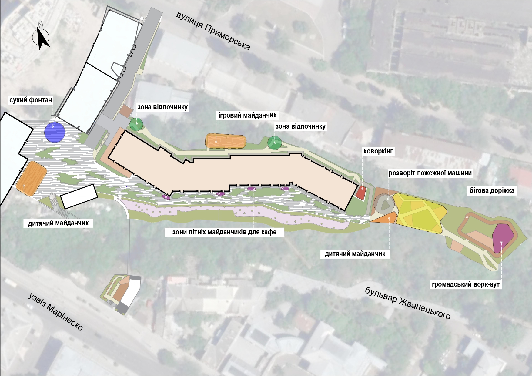 Генплан проєкту благоустрою та озеленення території «ЖК на Приморській» в Одесі від Bee Landscaping Bureau