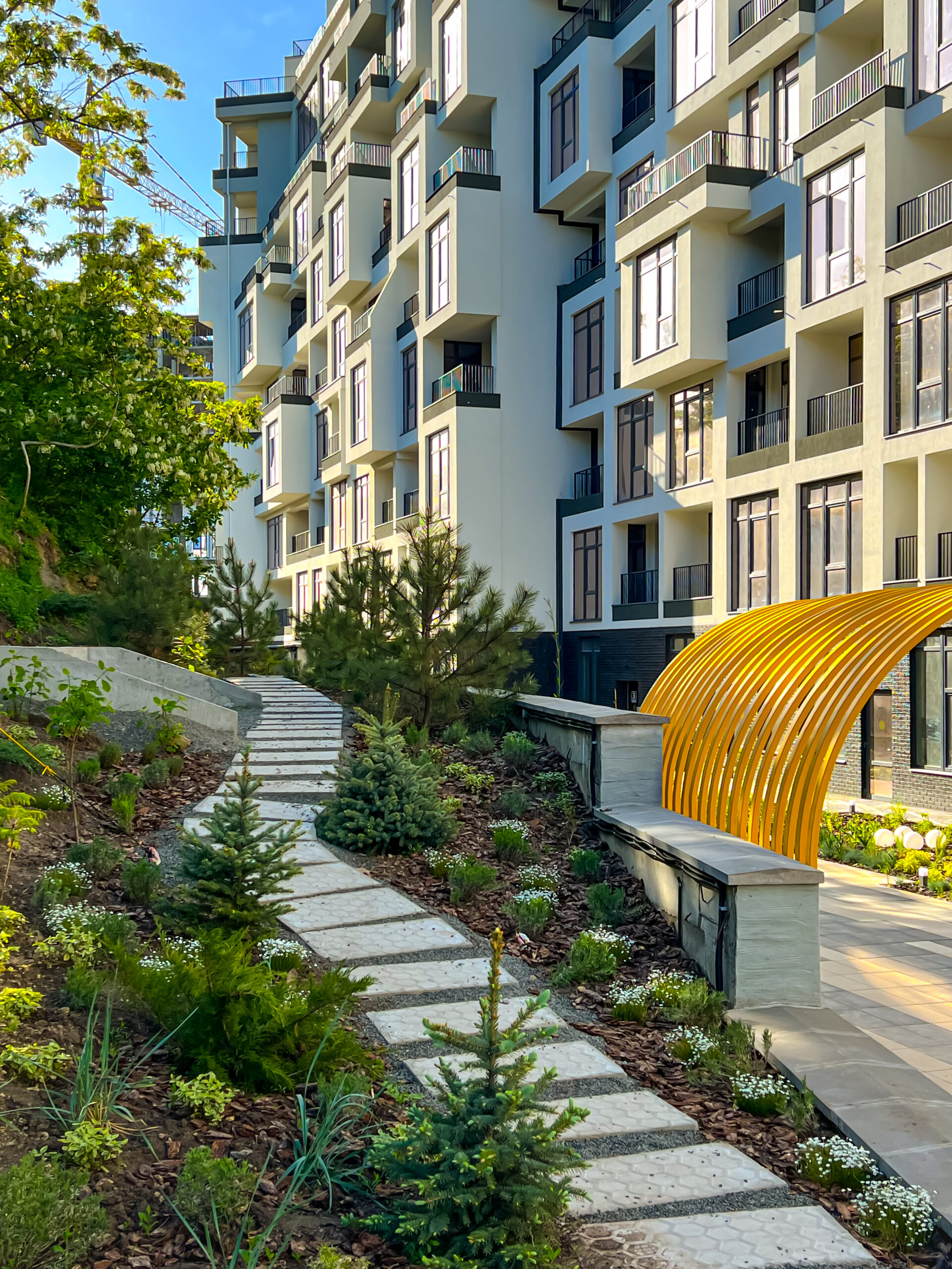 Через брак простору архітектори вирішили максимально обіграти стіну, і тому освітлення, перголи та лави спроєктували й розмістили прямо на ній. Висока підпірна стінка з одного боку та 7 поверхів будинку з іншого створюють так зване відчуття тунелю. Вони дають тінь на більшу частину ділянки, тому треба було розбавити стіну фарбами, аби візуально полегшити територію. Для МАФів обрали акцентний і сонячний жовтий колір. Окремої уваги заслуговують металеві жовті стільці, натхненням для яких став паризький сад Тюїльрі.