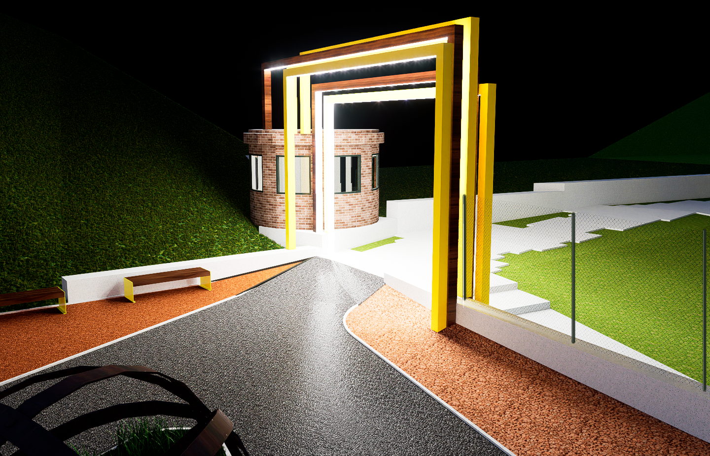 На вході до парку спроєктували яскраву арку як окрему інсталяцію, щоб вона притягувала погляди і «запрошувала» до території. Вона заввишки п’ять метрів (аби проїжджали пожежні машини), має шість секцій.