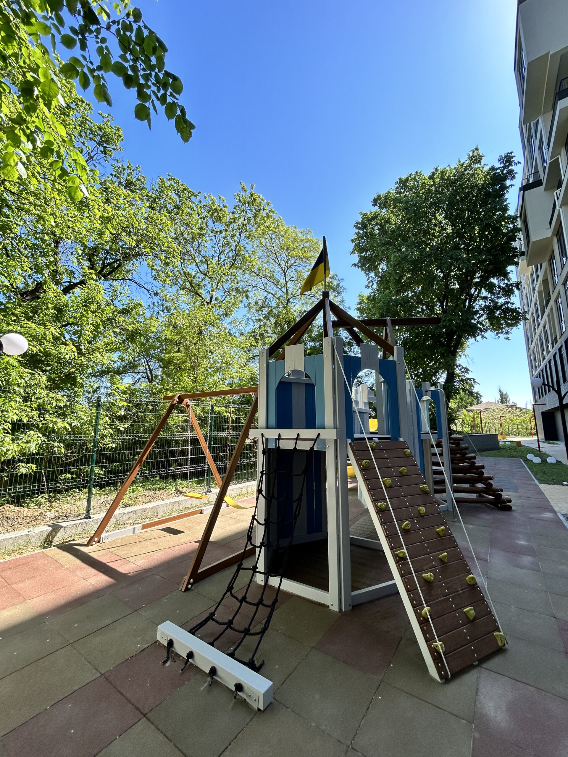 Екологічний дитячий майданчик-фортецю виконали у свіжих біло-голубих кольорах. Фото: Христина Шалигіна