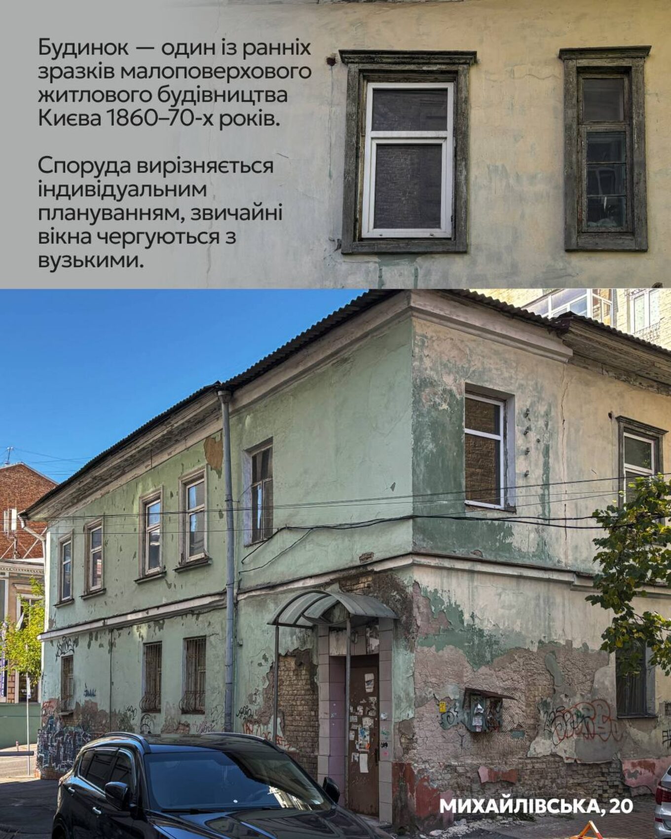 Йдеться про будинок на Михайлівській, 20, який є зразком первісної забудови вулиці. Був зведений у середині XIX століття, спершу належав титулярному раднику Шафировичу, згодом тут діяла жіноча школа.