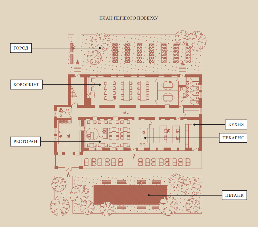 Передбачений також вільний доступ до коворкінгу, ресторану, городу, майданчику для гри в петанк та кінозалу, що використовуватиметься як укриття під час повітряних тривог.