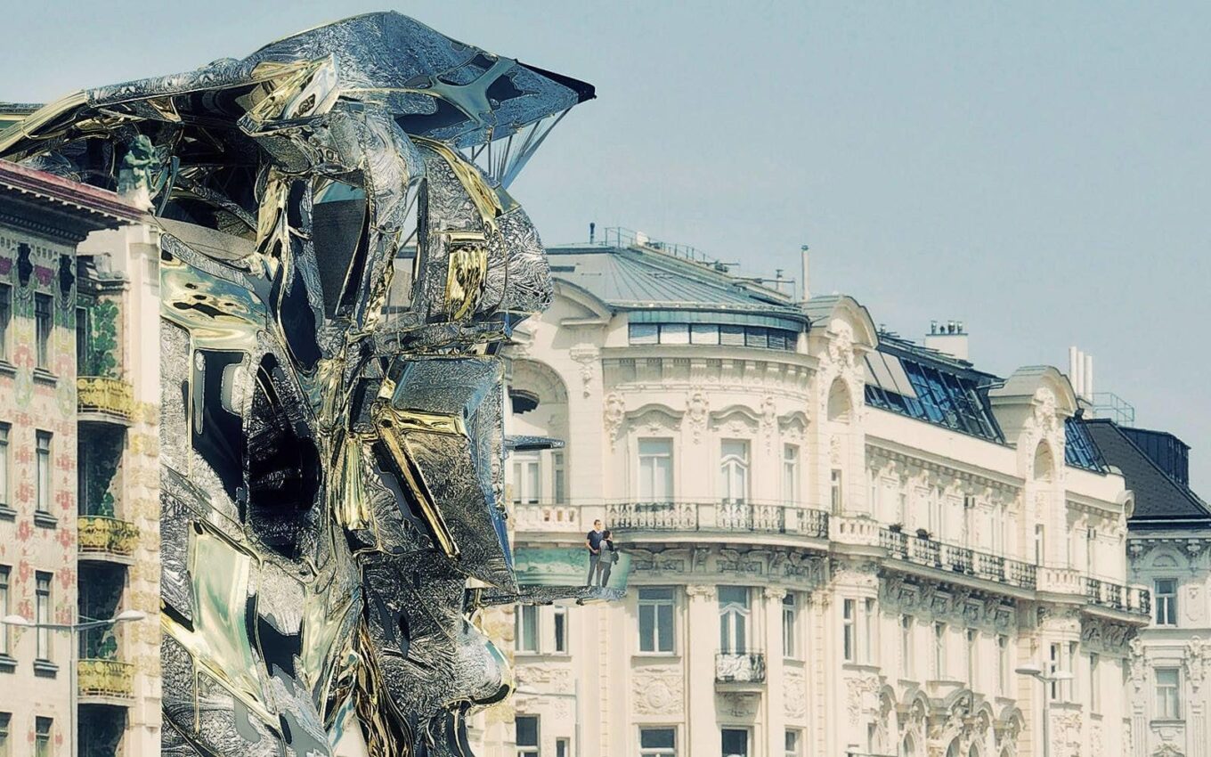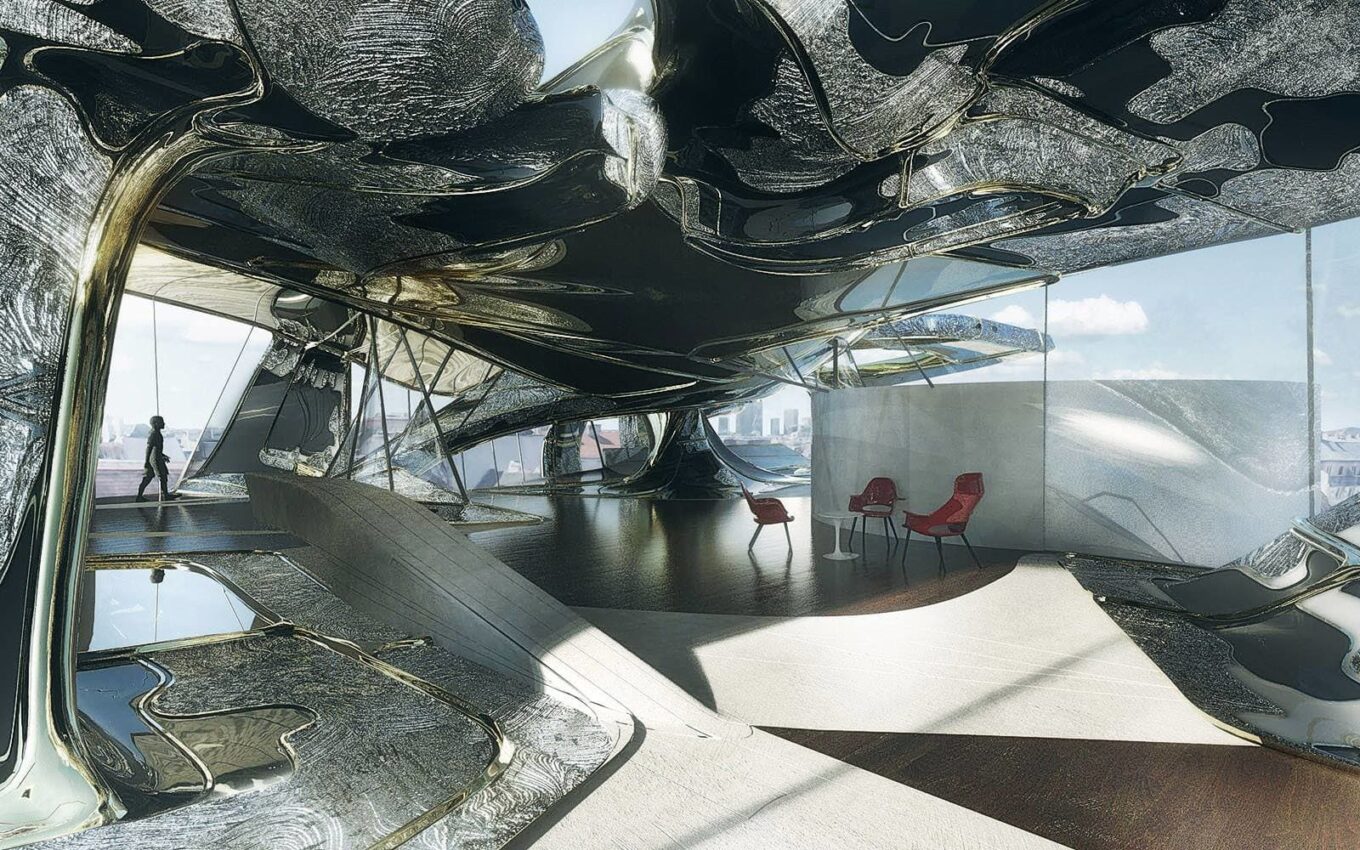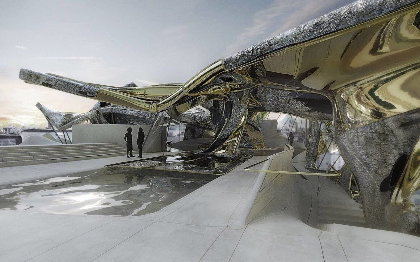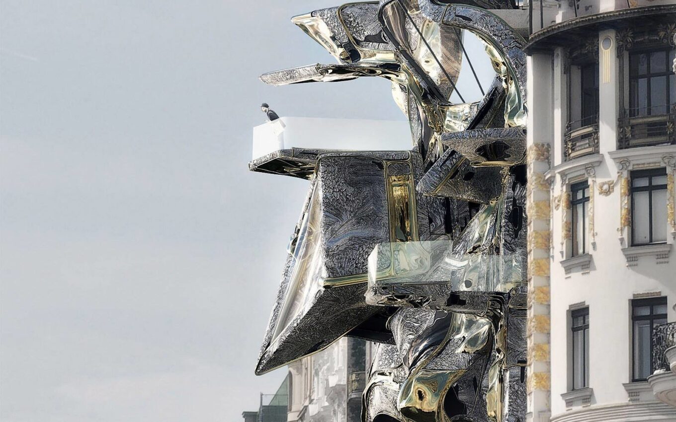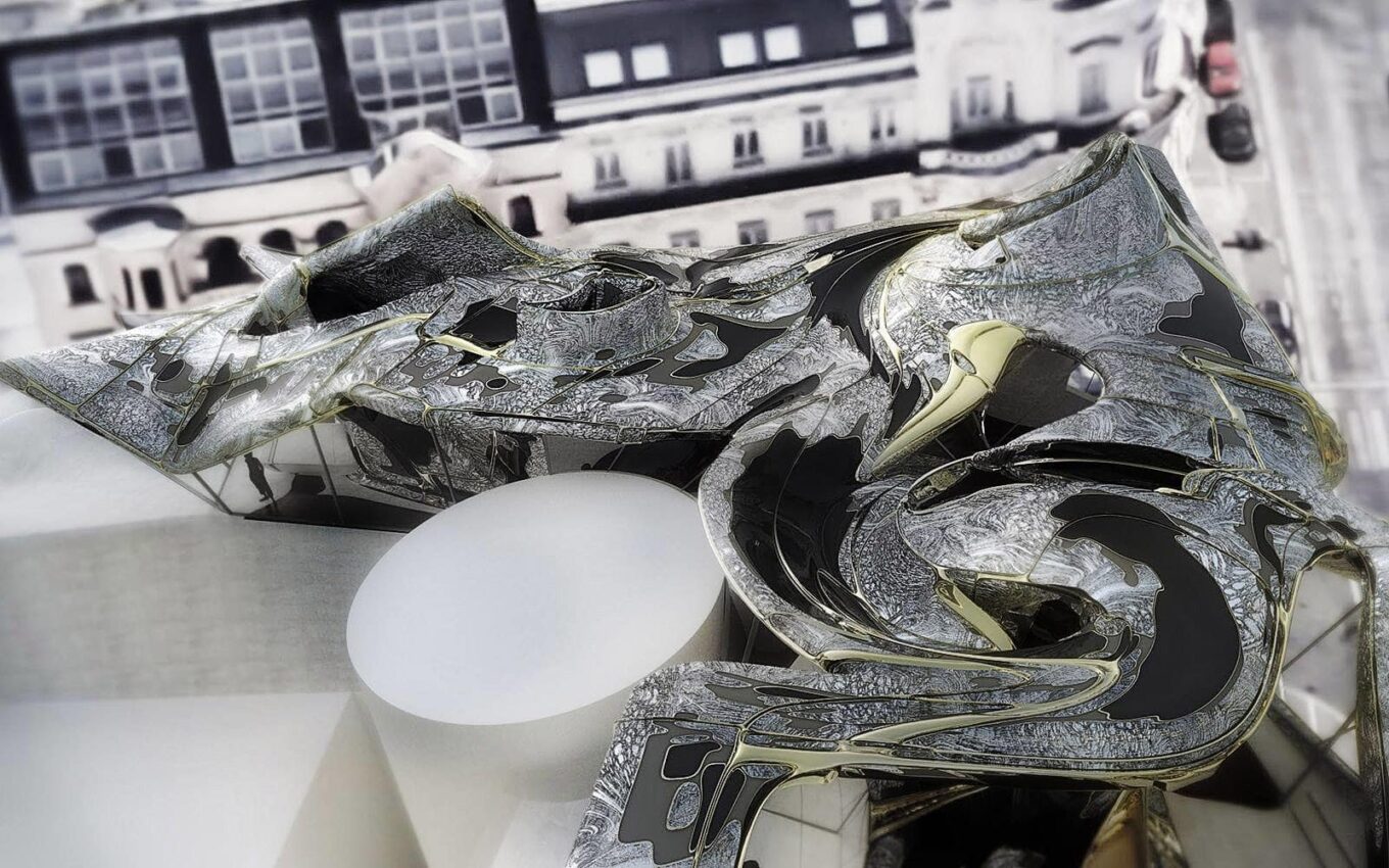 Линии крыши теперь напоминают сложную татуировку, фальшпанели словно стекают вниз по фасаду и балконам к тротуару. Золотые линии пронизывают серо-черный металл, создавая множество искаженных отражений.