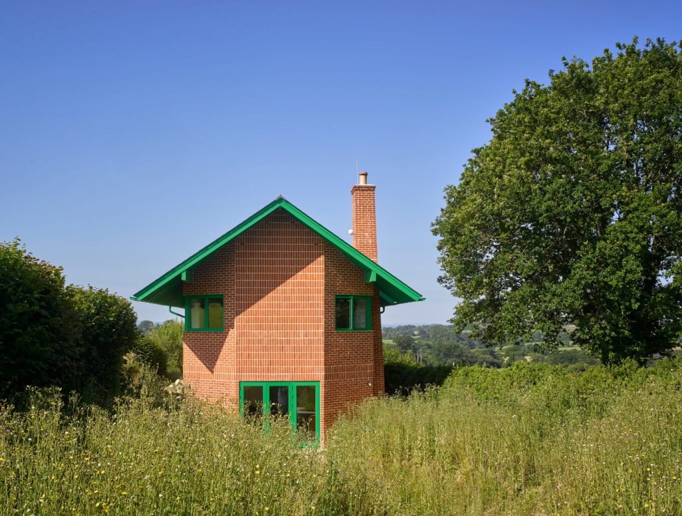 Розташована у сільській місцевості Дорсет, двоповерхова житлова споруда вирізняється своїм грайливим, але водночас стриманим екстер’єром, який поєднує візерунчасту червону цегляну кладку з яскраво-зеленими деталями.