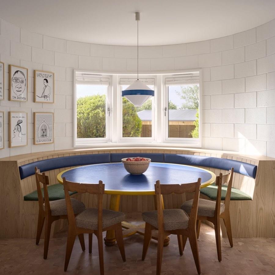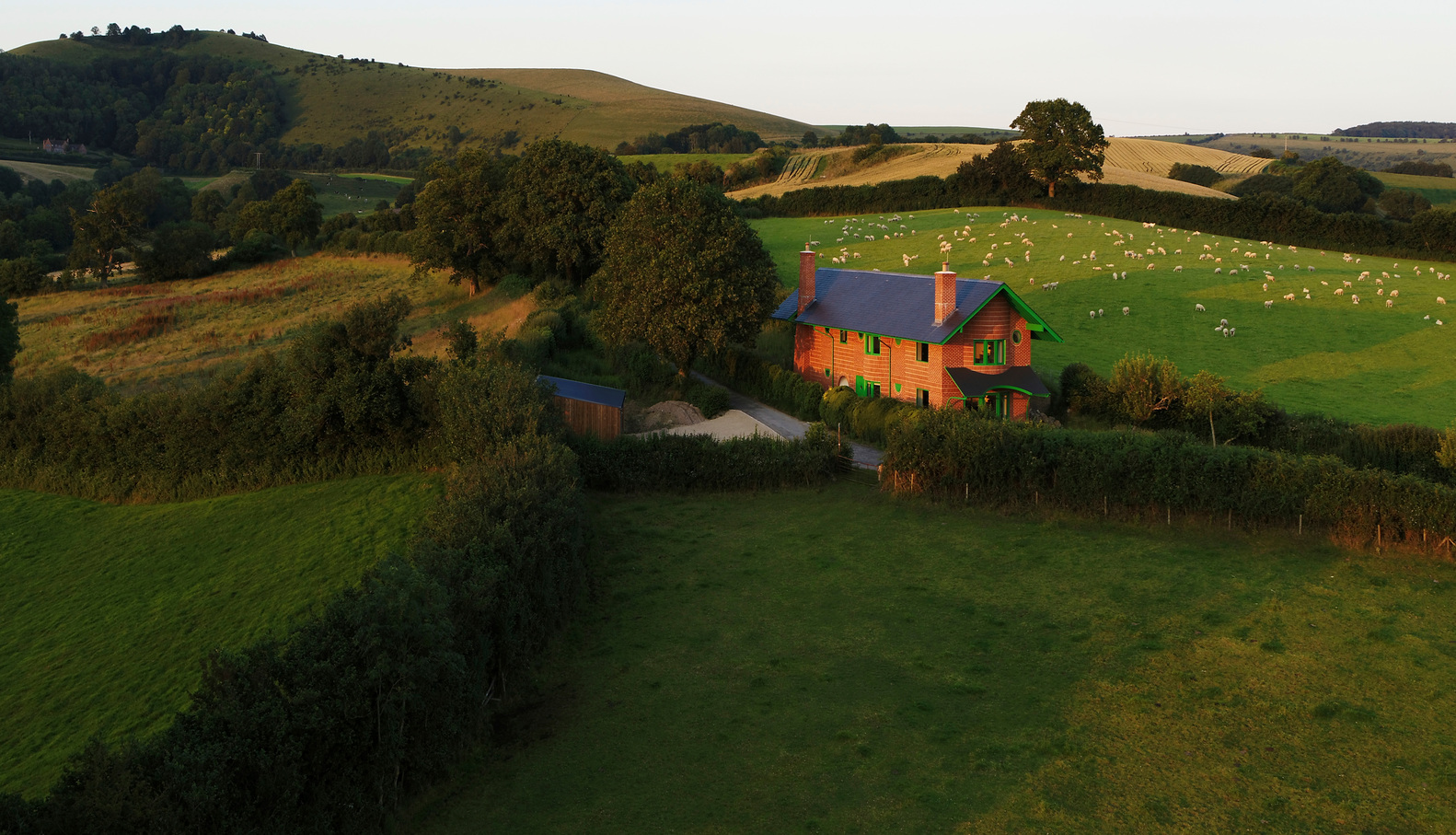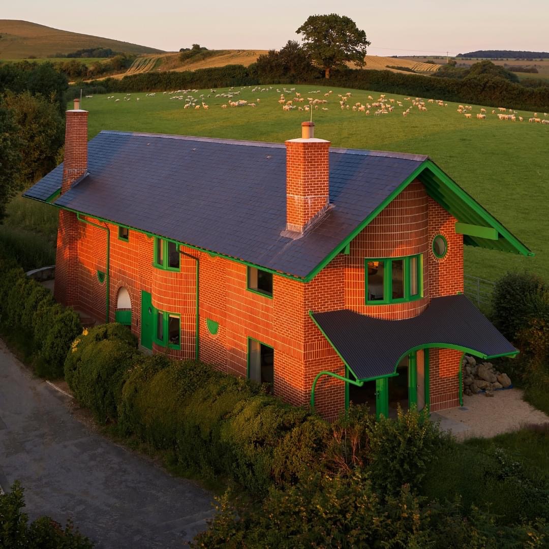 Розташована у сільській місцевості Дорсет, двоповерхова житлова споруда вирізняється своїм грайливим, але водночас стриманим екстер’єром, який поєднує візерунчасту червону цегляну кладку з яскраво-зеленими деталями.