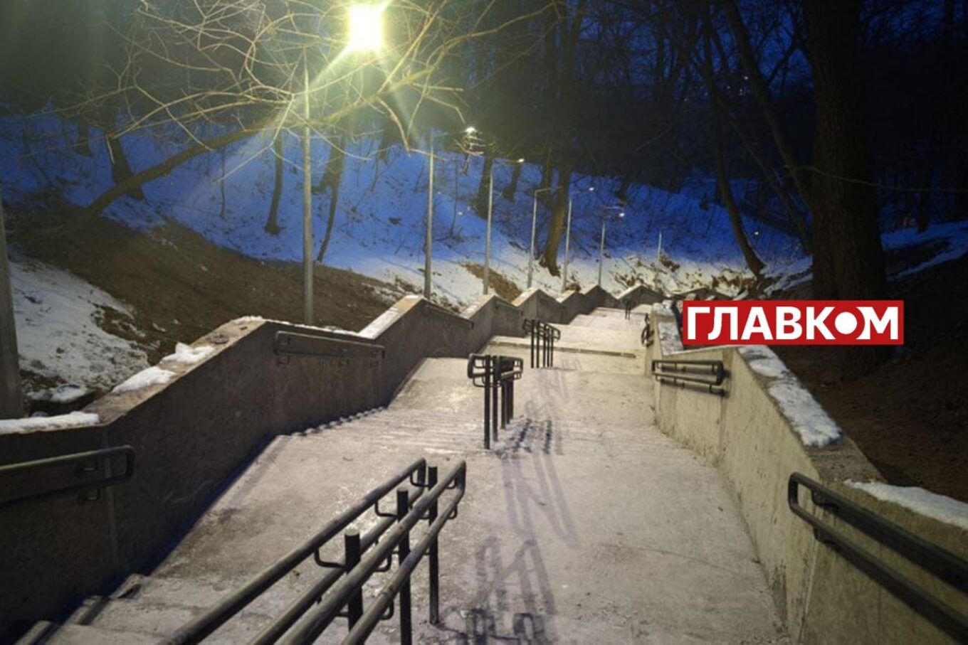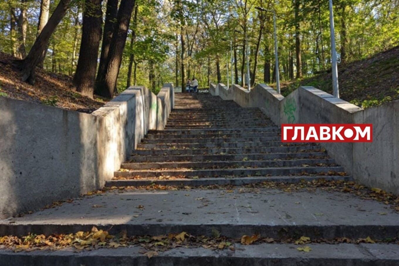 Сходи у парку “Нивки” після ремонту на початку 2024 року: висока бетонна стіна з перилами, посередині на бетонні доріжці ряд поручнів. Фото: Главком