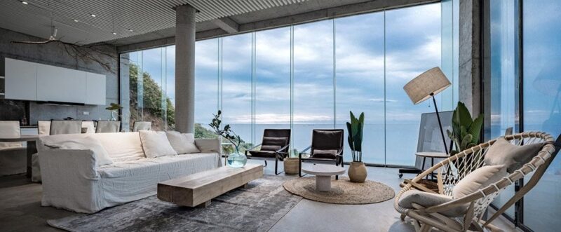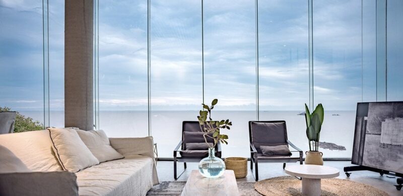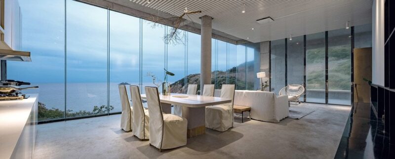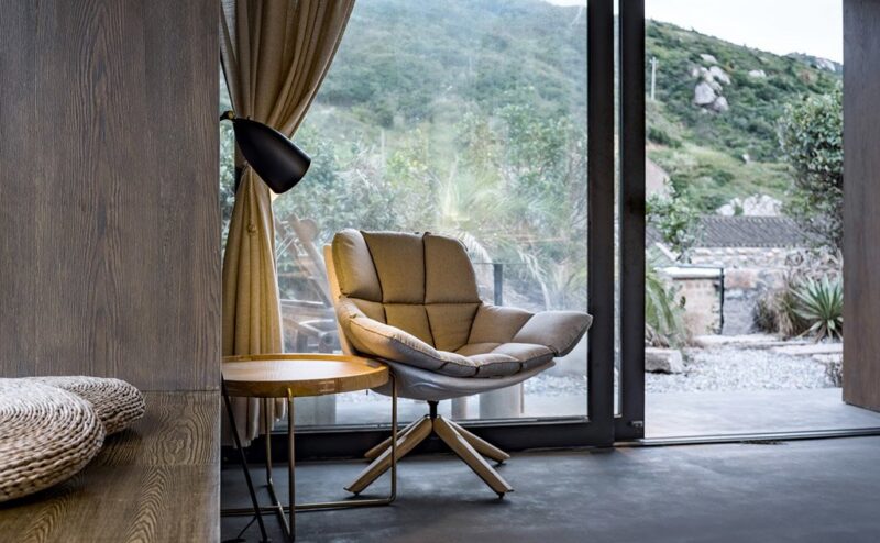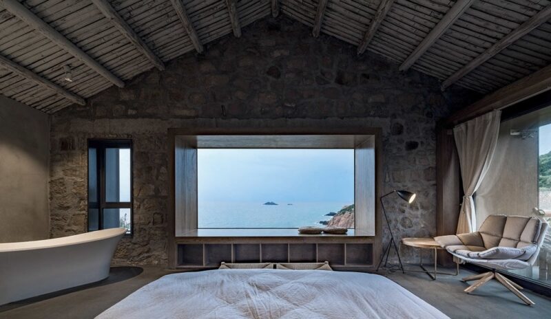 Помимо реновации существующих зданий, дизайнеры уделили большое внимание открывающимся из интерьеров видам на живописные окрестности. Для этого между старыми конструкциями они органично вписали новый современный блок – небольшую железобетонную конструкцию без излишнего декора с масштабной системой панорамного остекления.