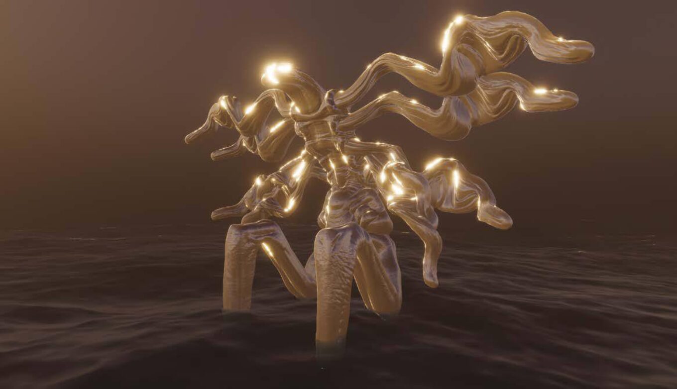 Вероніка Черідніченко представила віртуальну інсталяцію, що розмиває відчуття простору й часу, відображаючи екологічну катастрофу, спричинену руйнуванням Каховської ГЕС, та її вплив на ландшафт і свідомість людей.