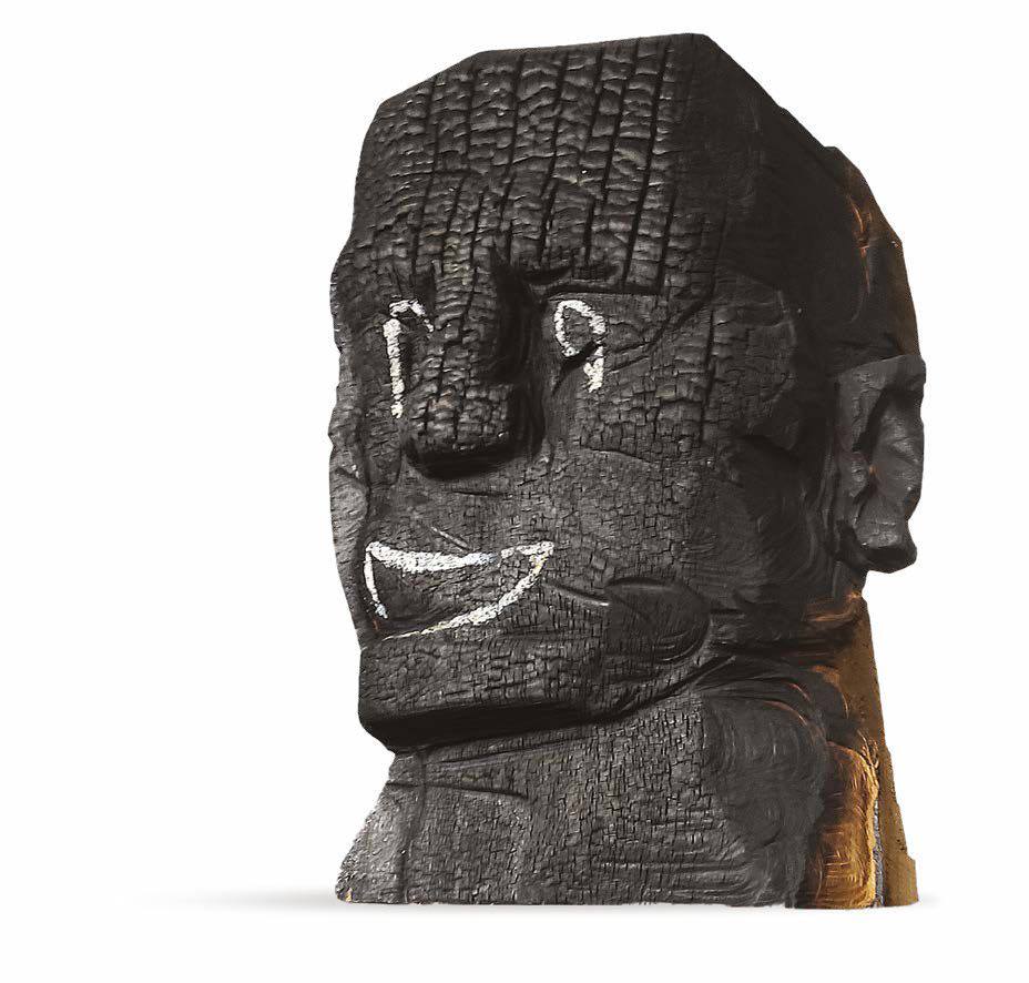 Володимир Семків створив скульптуру “Оптиміст” – обпалену дерев’яну голову з усмішкою, яка є символом надії, що зберігається навіть серед руйнувань.