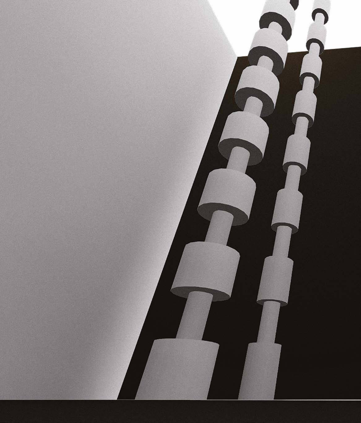 Інсталяція Олекси Фурдіяка “Подих” уособлює ритм та неперервність життя, символізуючи дихання нації між війною та миром через чергування чорних циліндрів, що нагадують легені.
