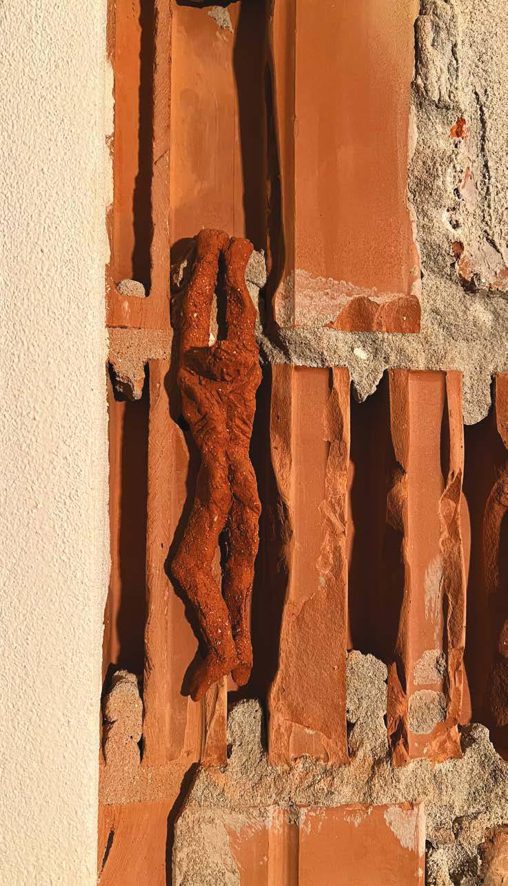 Ольга Кузюра представила інсталяцію з білих кистей рук, що виступають зі стіни, символізуючи фізичні втрати українського народу та незламність духу в боротьбі за майбутнє.