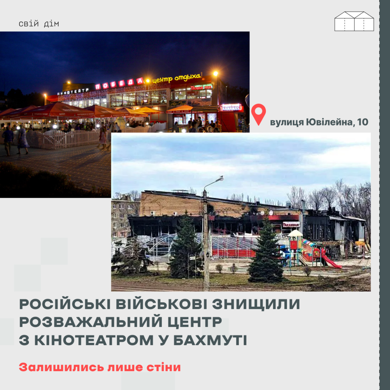 Російська армія знищила будівлю кінотеатру “Победа” у Бахмуті із сучасним кінозалом, нічним клубом, кафе, дитячою кімнатою та арткав’ярнею.