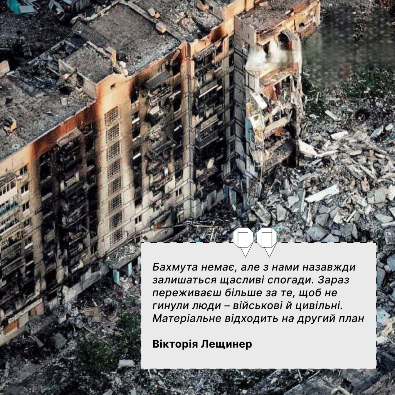 “Бахмутяни втратили все. Затишне квітуче місто з історичними будівлями перетворилося на попіл. Там більше не пахне трояндами, у вікнах не горить світло, не лунає дитячий сміх. Війна розкидала нас по країні та світу. Ми тримаємося, донатимо й віримо в перемогу. А держава повинна потурбуватися про тих, хто залишився без житла і роботи”, – каже пані Вікторія.