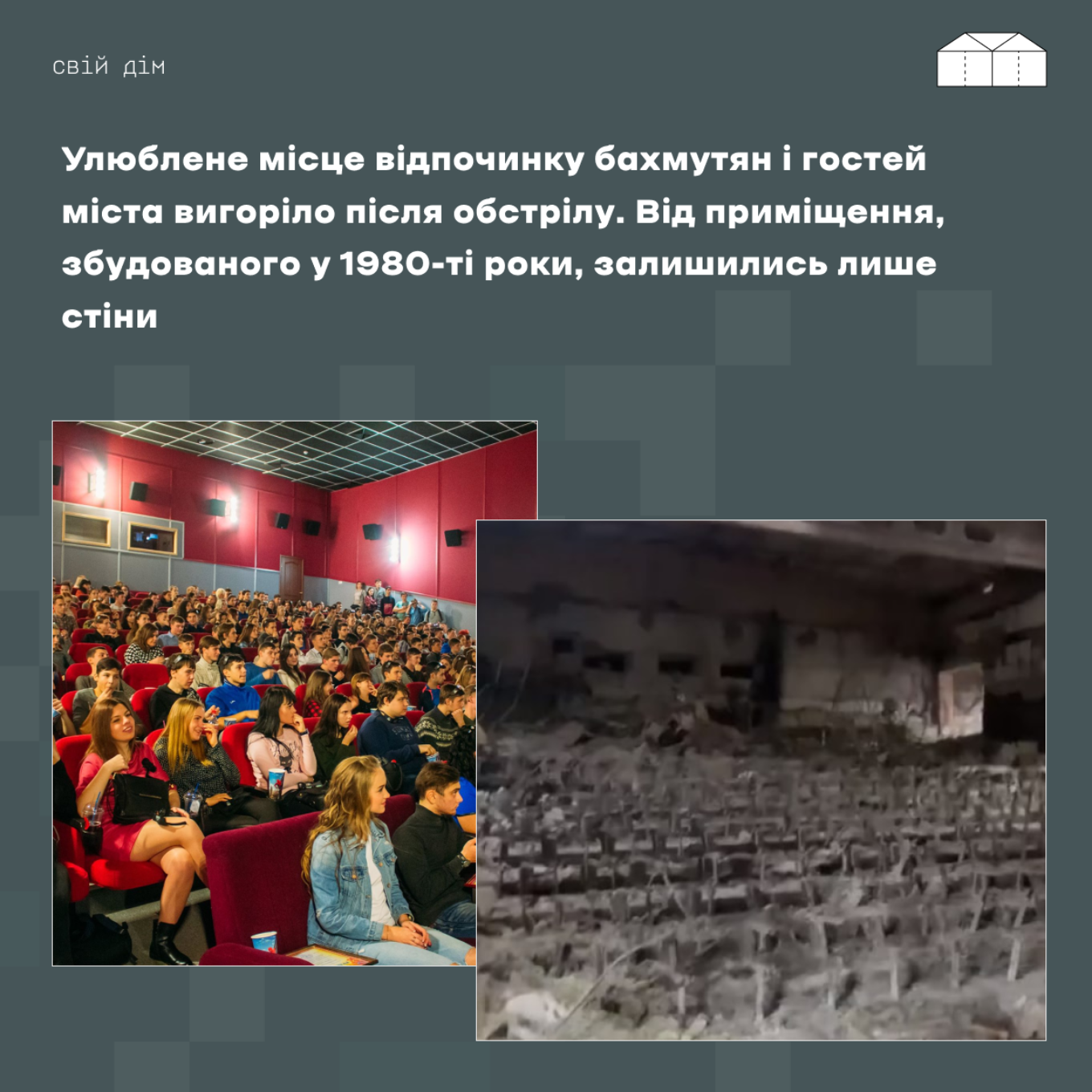 Кінотеатр “Победа” теж був тією ниточкою, яка зв’язувала людей Бахмутом, тому що вони не будуть жити у місті, де повністю зруйнована інфраструктура. Де немає шкіл, садочків, лікарень і місць відпочинку.