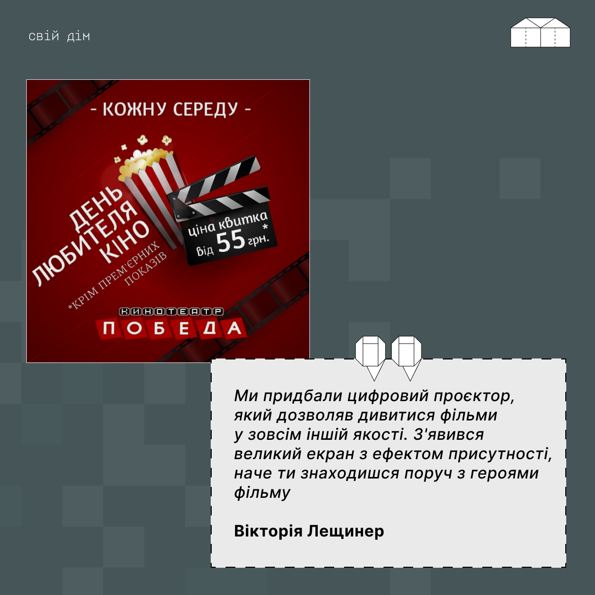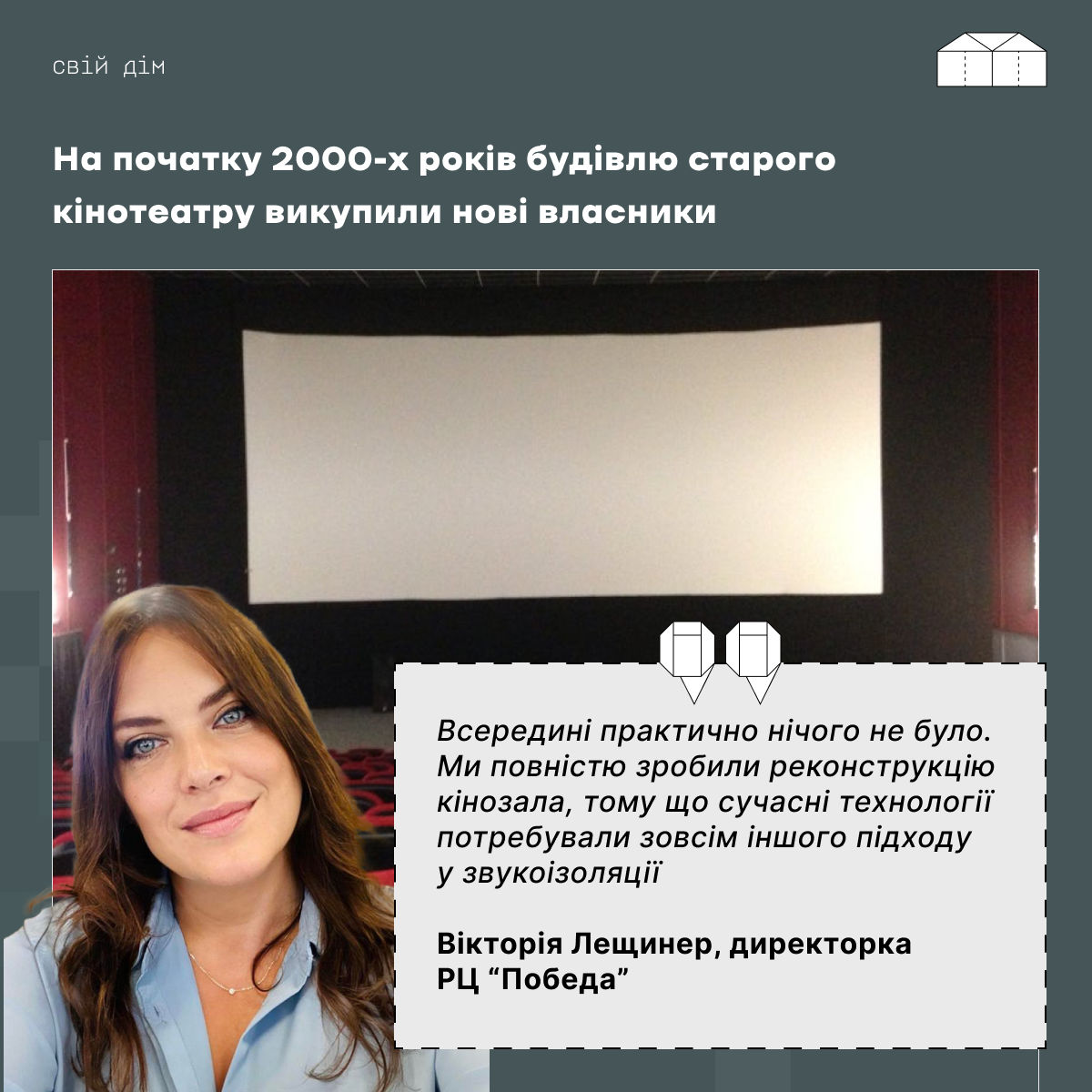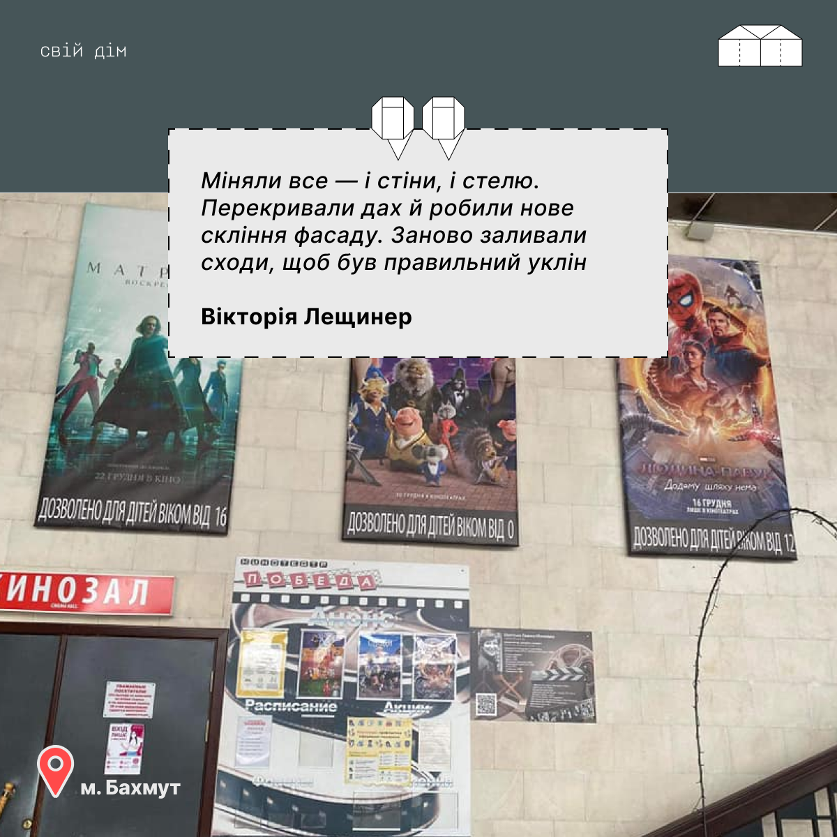 Кінотеатр “Победа” теж був тією ниточкою, яка зв’язувала людей Бахмутом, тому що вони не будуть жити у місті, де повністю зруйнована інфраструктура. Де немає шкіл, садочків, лікарень і місць відпочинку.