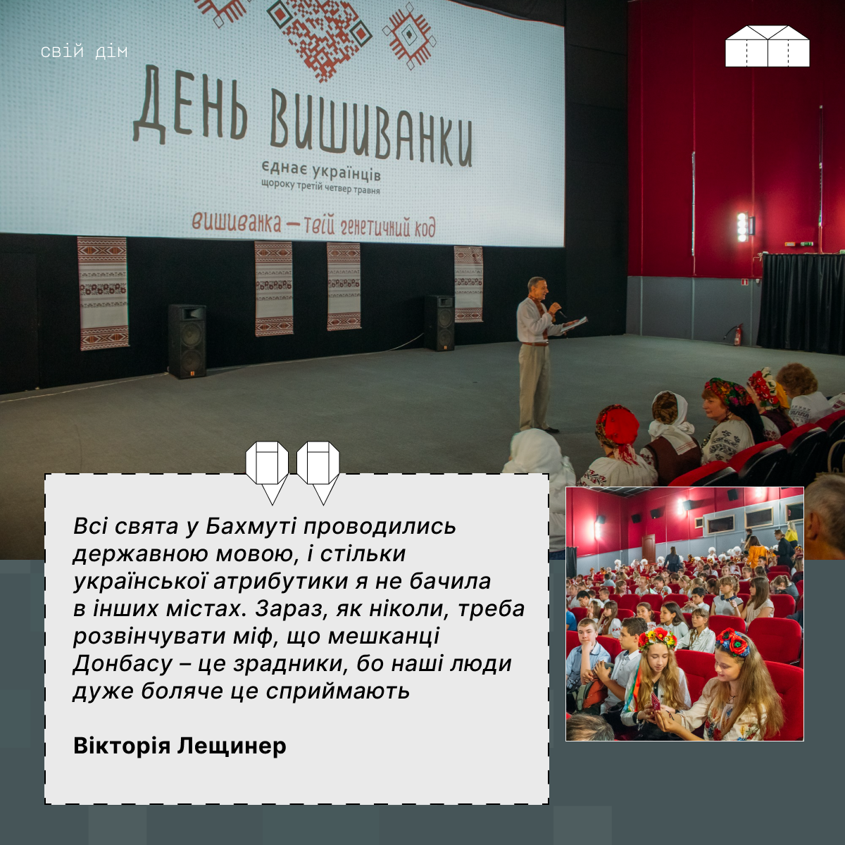 “Поїхати зі свого дому – це важке рішення для кожного українця. Ти стоїш біля будинку й пригадуєш кожну картинку щасливого життя. Тебе тримає кожна річ. Вона наче тебе зв’язала і ти не можеш рушити з міста. Але це все матеріальне, воно не повинно нас тримати. Найцінніше – це життя”.