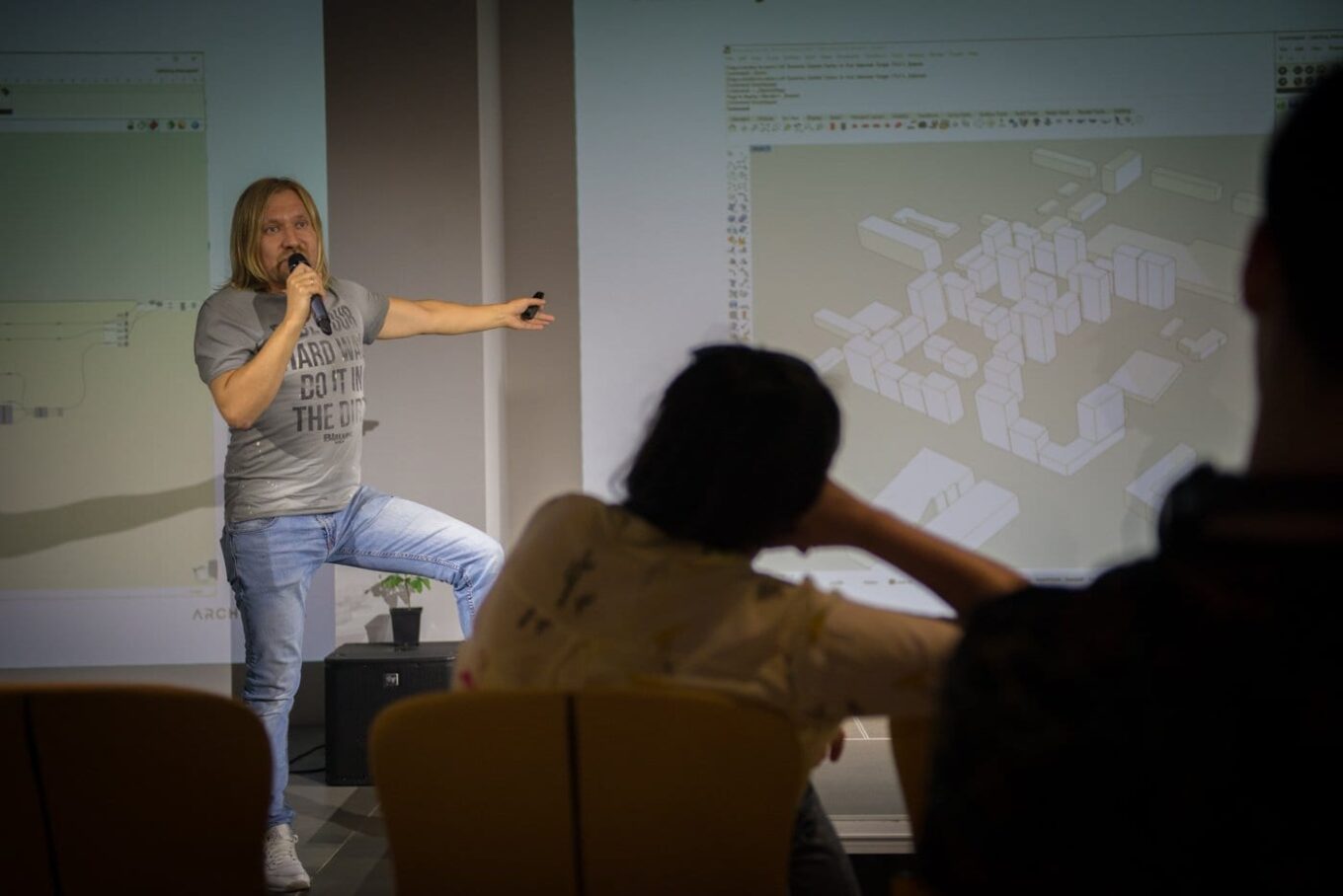 Соучредитель и главный архитектор компании ARCHIMATIKA Дмитрий Васильев выступил с лекцией об алгоритмах и технологиях, разработанных техотделом компании и применяемых при проектировании параметрических зданий и жилых районов.
