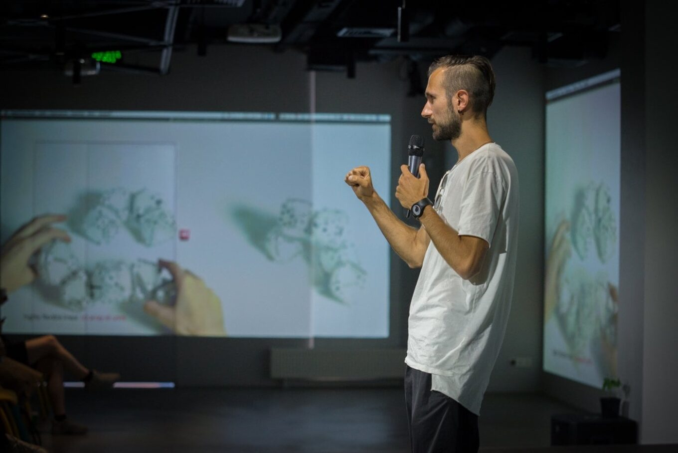 Дмитрий Аранчий выступает перед участниками хакатона «СИНХРО-ПРОСТРАНСТВО» с рассказом о трансформирующейся, «живой» архитектуре, которая появится на улицах городов в недалеком будущем