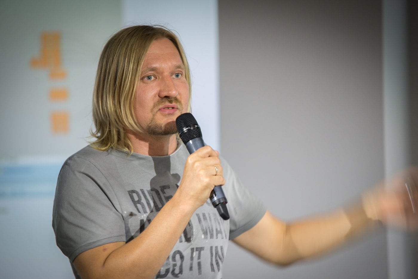 Дмитрий Аранчий выступает перед участниками хакатона «СИНХРО-ПРОСТРАНСТВО» с рассказом о трансформирующейся, «живой» архитектуре, которая появится на улицах городов в недалеком будущем