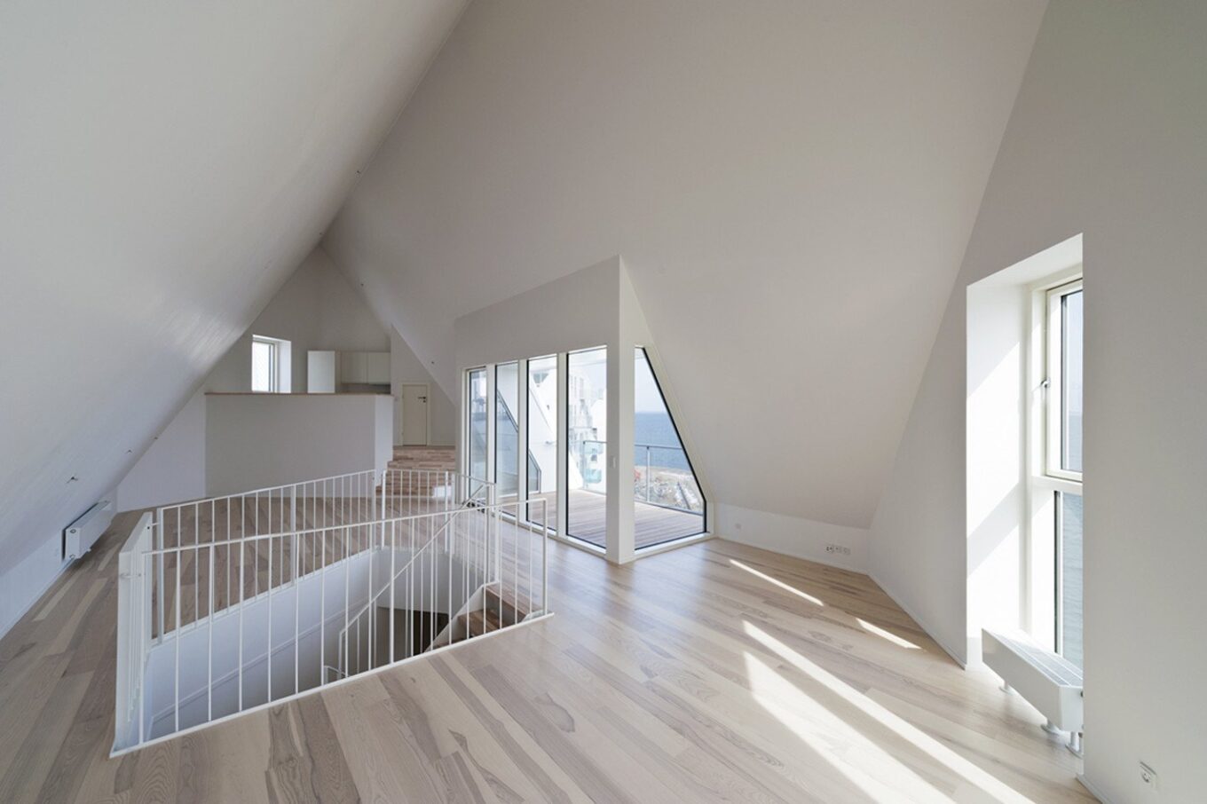 Световые окна в крышах, расположенных под острым углом, позволяют максимально инсолировать квартиры. В течение дня даже низкое северное солнце становится обязательным гостем в комнатах.