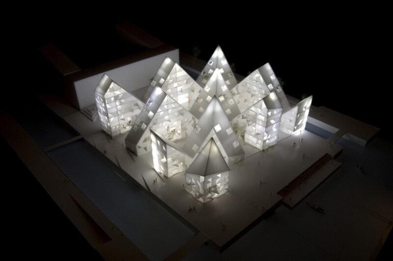 Общий облик жилого комплекса на 208 аппартаментов получился на редкость визуально привлекательным. Остроконечные крыши разной высоты создают хаотическую зубчатую линию, напоминая ледяную гряду айсберга.