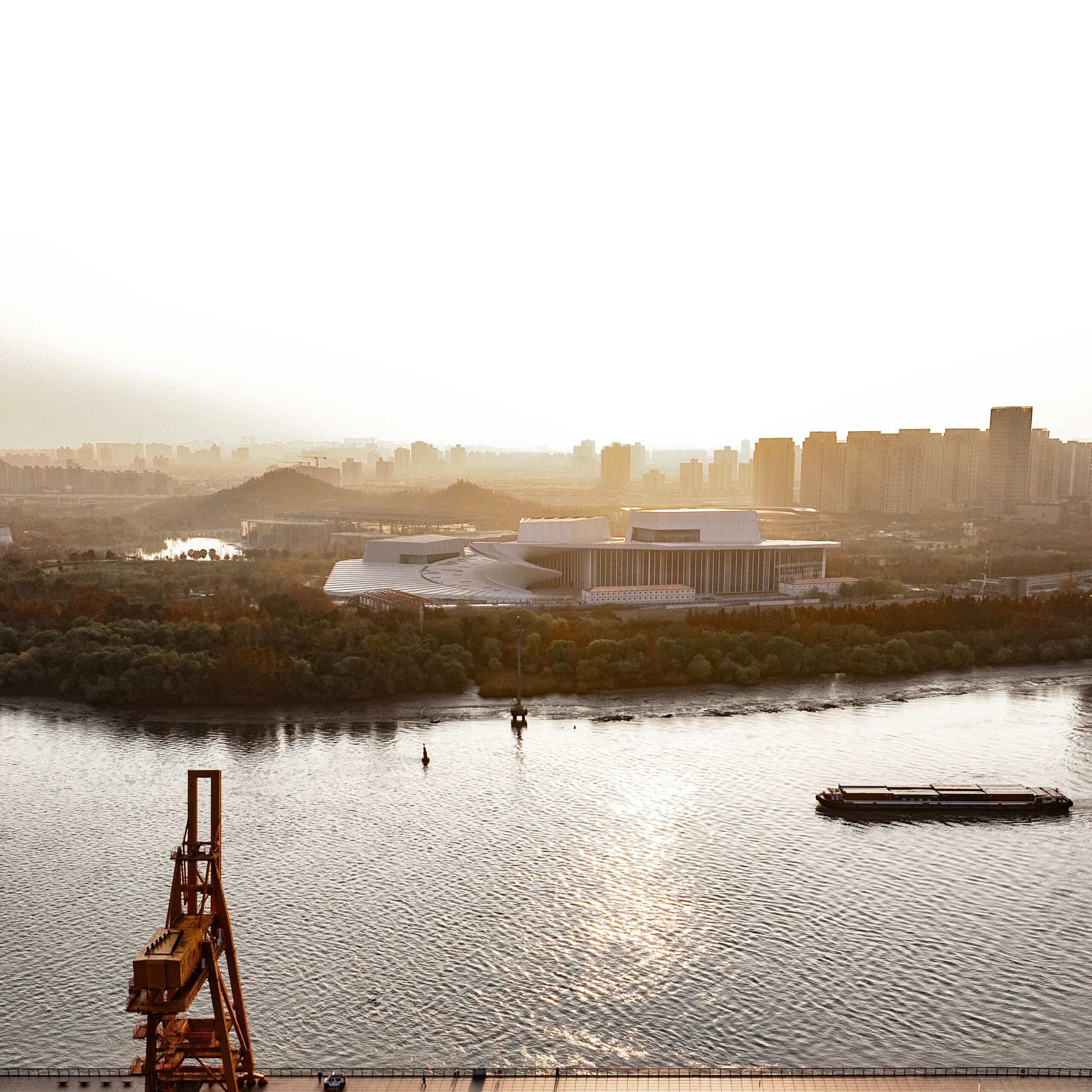 Будівля розташована на опуклому березі річки та займає ключову ділянку в межах нового культурного мастерплану Шанхаю. Її виразний спіралеподібний дах утворює безперервний маршрут уздовж периметра, піднімаючись від землі широкою дугою. Цей жест відсилає до руху води Хуанпу та формує яскраву громадську домінанту, помітну з протилежного берега.