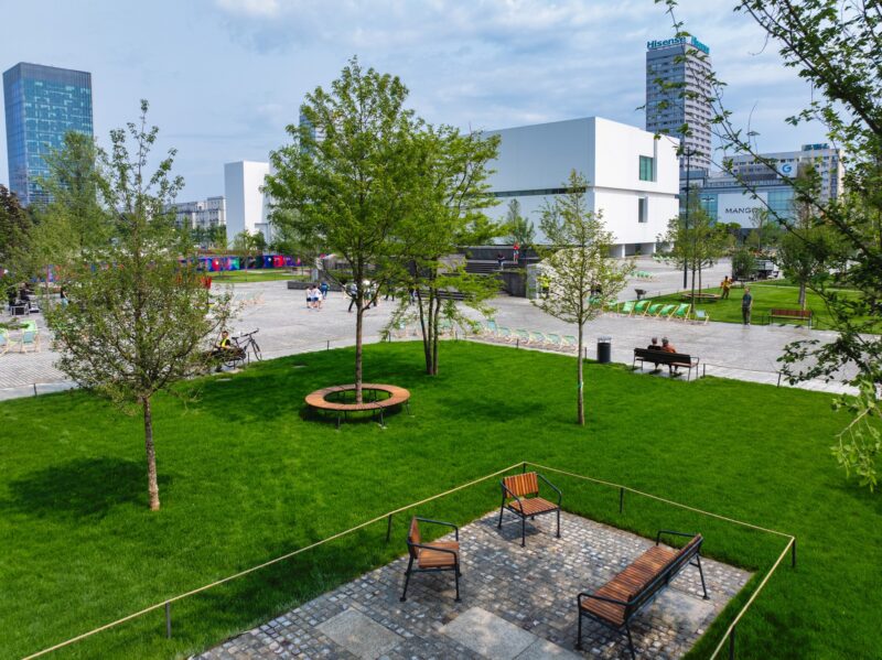 Проєкт реконструкції розробила архітектурна студія A-A Collective. Оновлена площа стала справжнім оазисом у центрі міста: тут висадили понад 100 дерев, близько 550 кущів та понад 81 тисячу цибулинних і багаторічних рослин. Для зручності містян розмістили 106 лавок і місць для сидіння. Аби підтримувати озеленення, під землею облаштовано чотири резервуари для збору дощової води, яку використовуватимуть для поливу, пише WhiteMAD.