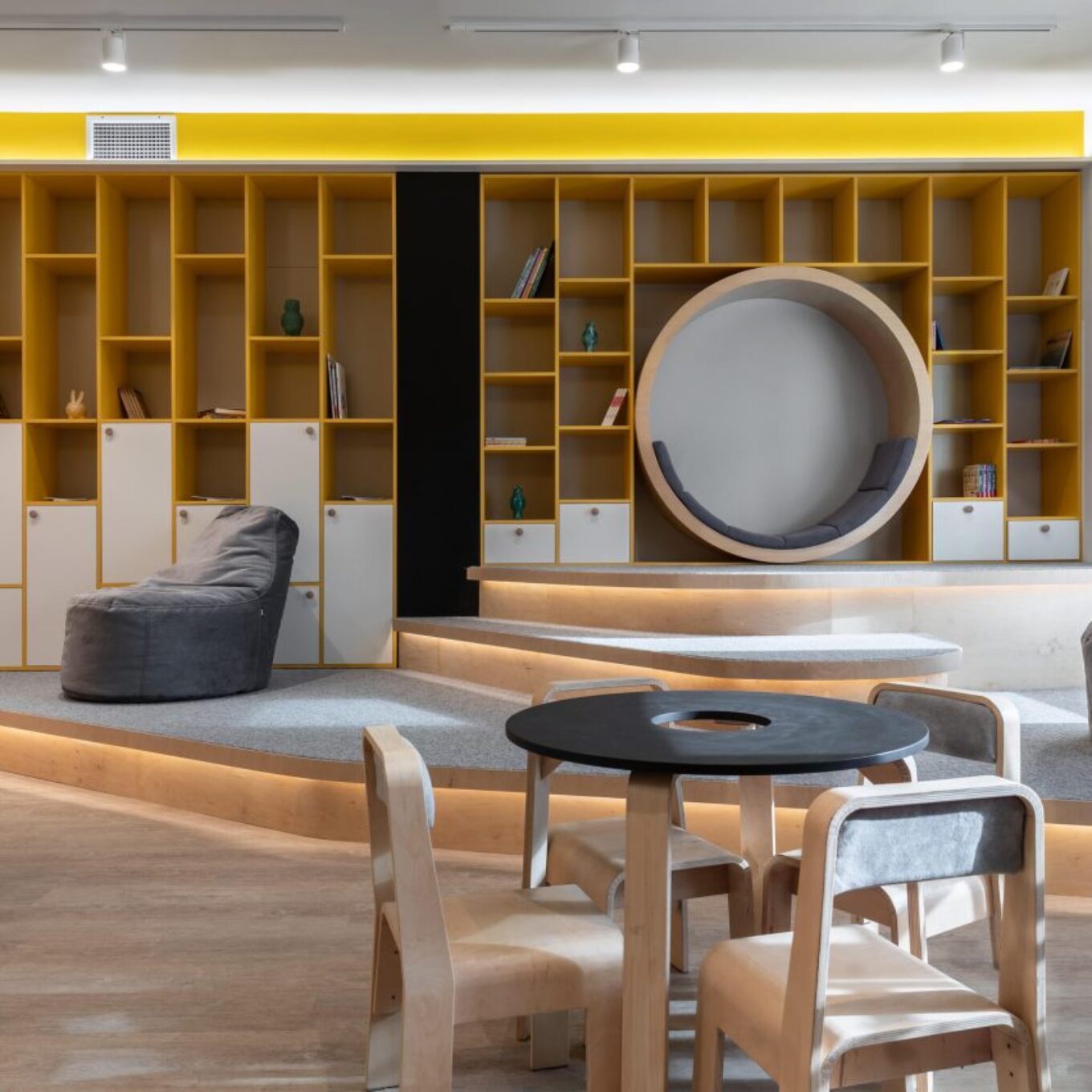 Його інтер’єр простий і функціональний: затишна кімната для зустрічей та яскравий офіс оформлені в домінуючій палітрі білого та теракотового кольорів з сонячно-жовтими акцентами в дитячих зонах.