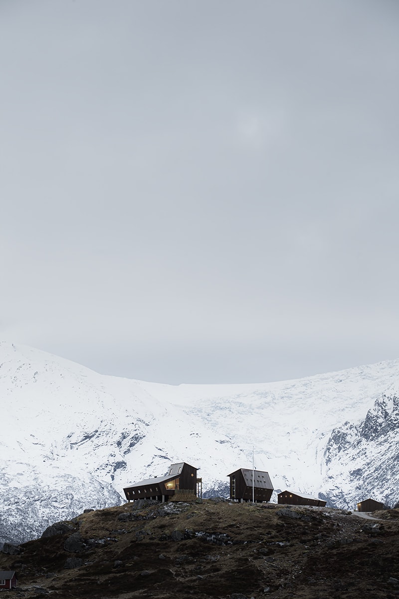 Серия пятиугольных кают из клееного бруса и сосновой доски установлена на месте бывшего городка альпинистов, разрушенного в 2011 году циклоном Дагмар. Юго-западный штормовой ветер нанес удар по Норвегии и Финляндии в рождественскую ночь. Дагмар вошел в историю как один из самых разрушительных европейских циклонов – он нанес убытки на $45 миллионов. На фоне крупного национального ЧП разрушение туристических хижин в горах – выглядят мелкой неприятностью. Но для норвежских альпинистов и треккеров это было серьезным ударом, поскольку восхождение на ледник Юстедалсбреен является одним из самых популярных международных маршрутов как среди профессиональных спортсменов так и среди туристов, желающих полюбоваться уникальным голубым глетчерным льдом.
