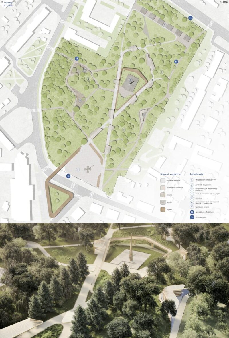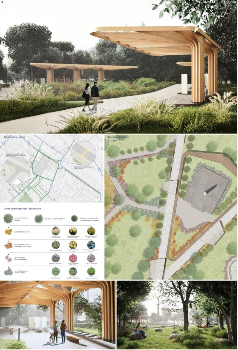 Перше місце посів проєкт Aranchii Architects, який відзначили за оригінальність, нестандартне просторово-планувальне рішення, а також за збережений баланс між меморіальною функцією й потребами містян.