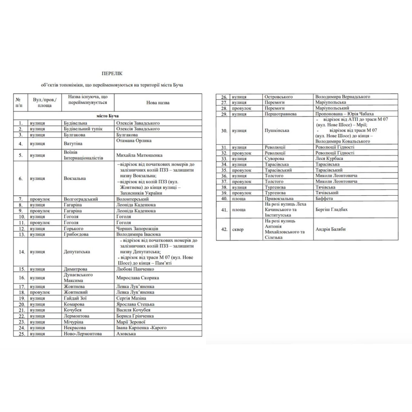 Загалом у списку на перейменування у Бучі було 42 топоніми. Так, у місті перейменували вулиці Ватутіна, Гагаріна, Горького, Грибоєдова, Лермонтова, Некрасова, Толстого й Тургєнєва у рамках дерусифікації та декомунізації.