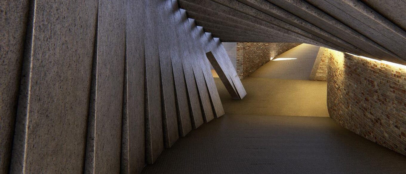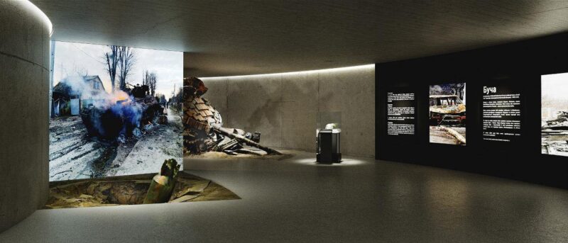 Головна споруда матиме перевернуту конструкцію — як символ перевернутого життя містян, які втратили все. А коридор, що занурюється під землю і повертається назад до світла, передає шлях, яким пройшли люди — від страху до надії.