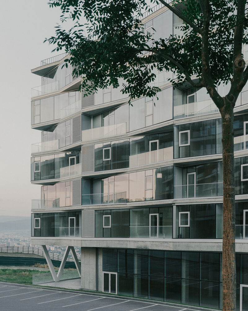 Крім того, будівля органічно враховує рельєф: паркінг приховано в перепаді висот, а житлові рівні піднесено для кращих видів.