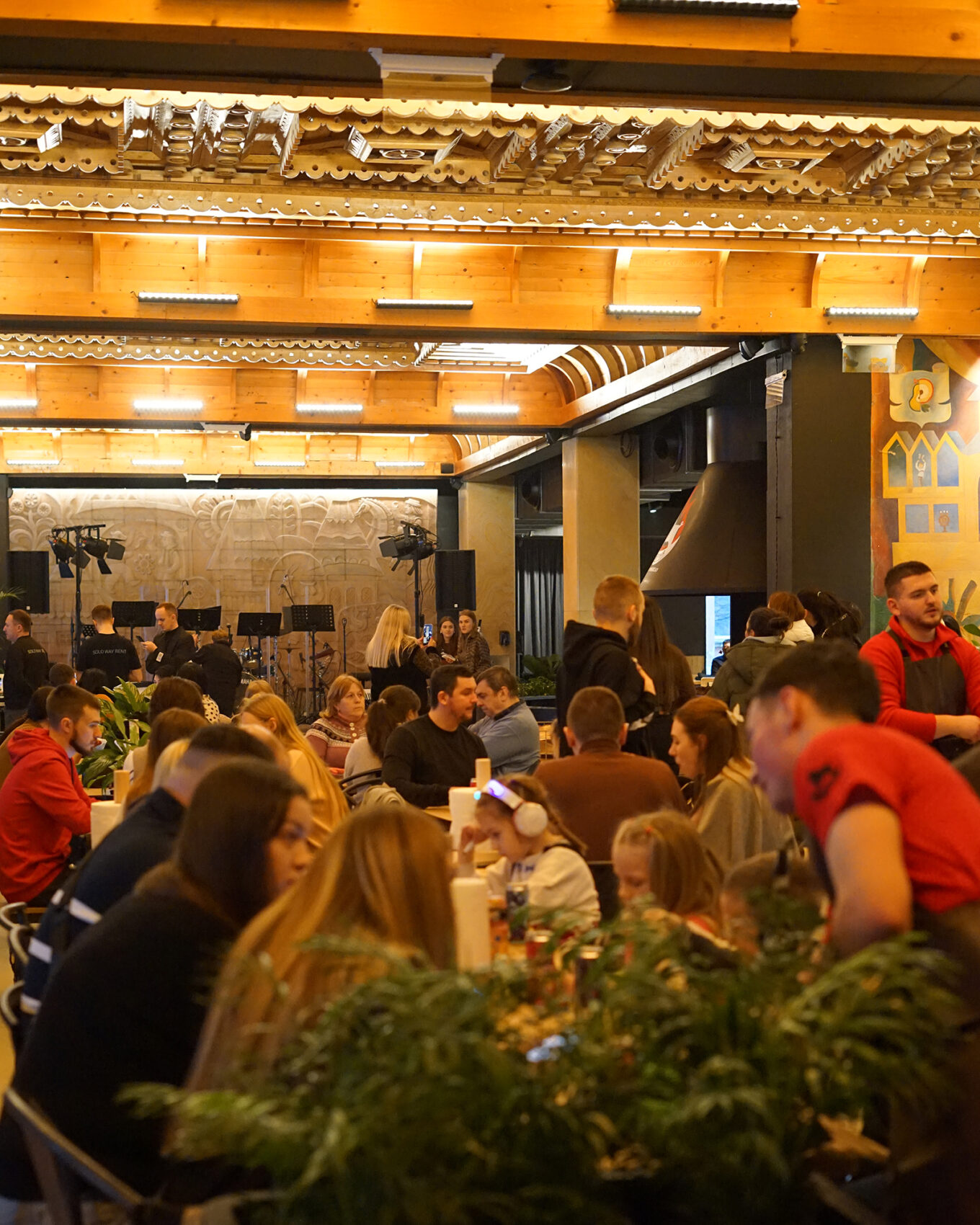 Під час реконструкції власники вирішили не демонтувати старе оздоблення, а інтегрувати його в сучасний дизайн. В інтер’єрі залишили автентичні дерев’яні панелі, складні різьблення та оригінальні розписи, які прикрашали стіни кафе ще з вісімдесятих років.
