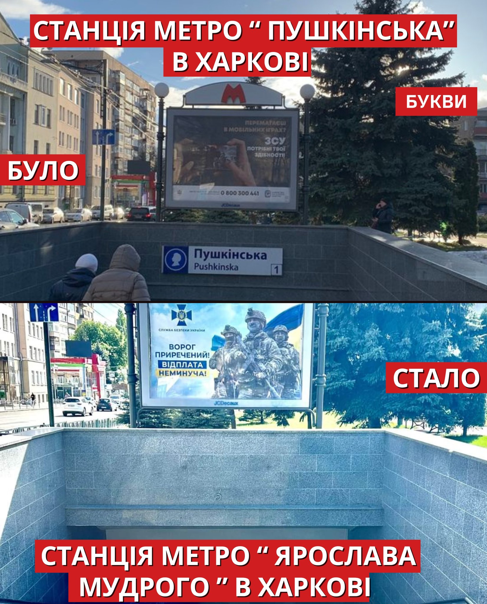 Також перейменували станцію метро “Пушкінська”. 26 квітня 2024 року топонімічна комісія, між двома пропозиціями, обрала нову назву — “Ярослава Мудрого”.