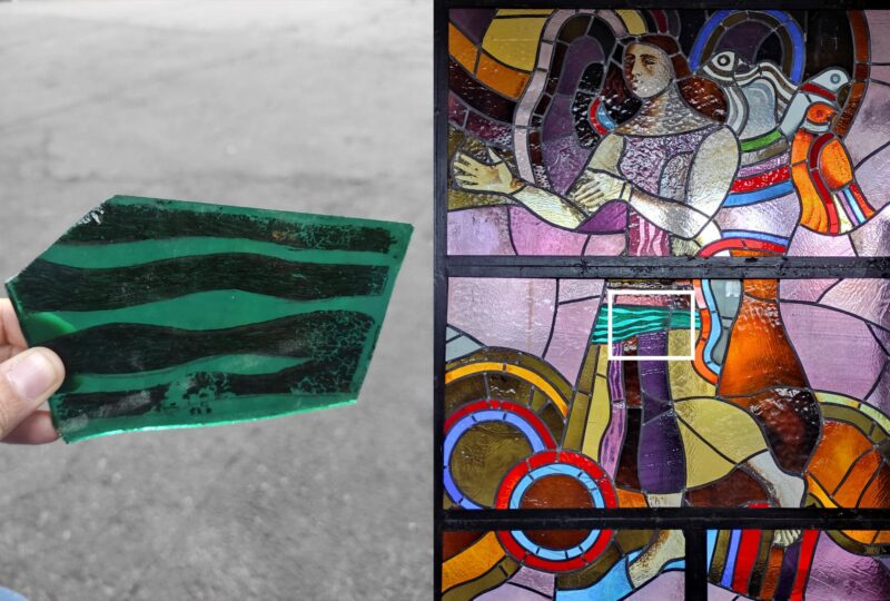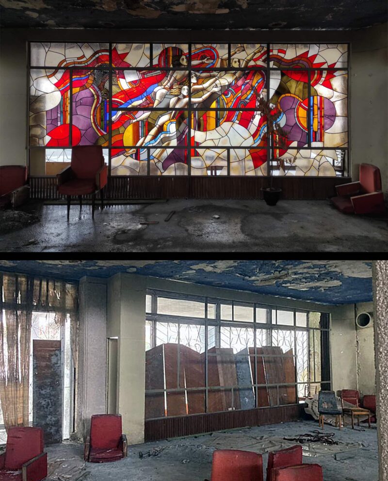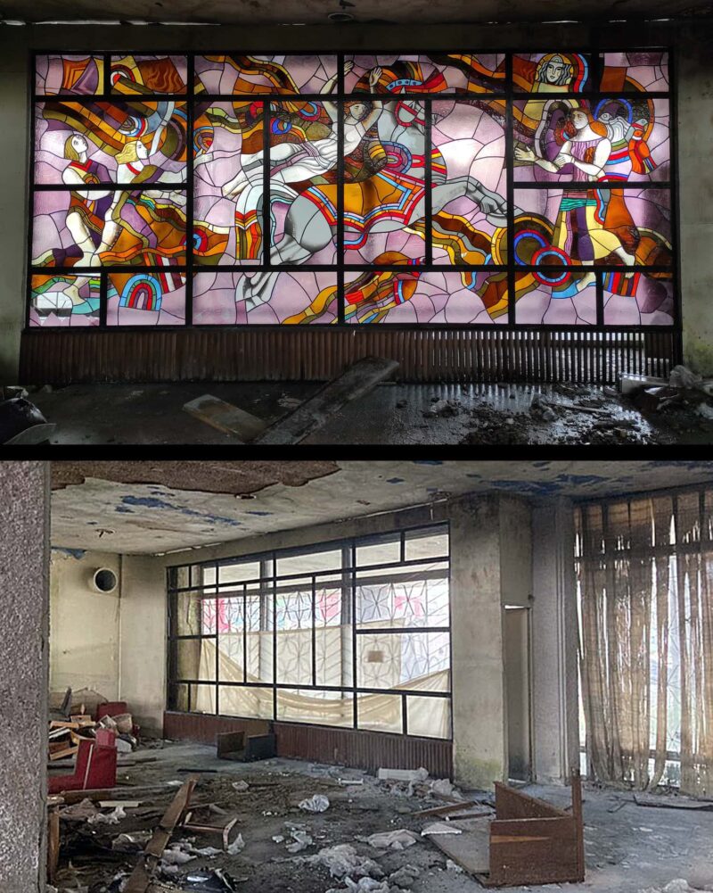 Тепер, за повідомленням активістів, вони зникли, а подвір’я всипане кольоровим склом. Напередодні вітражі, які художниця створила у 1985 році, внесли до списку цінних пам’яток, що перебувають під загрозою зникнення. Утім, це не посприяло їхньому порятунку.