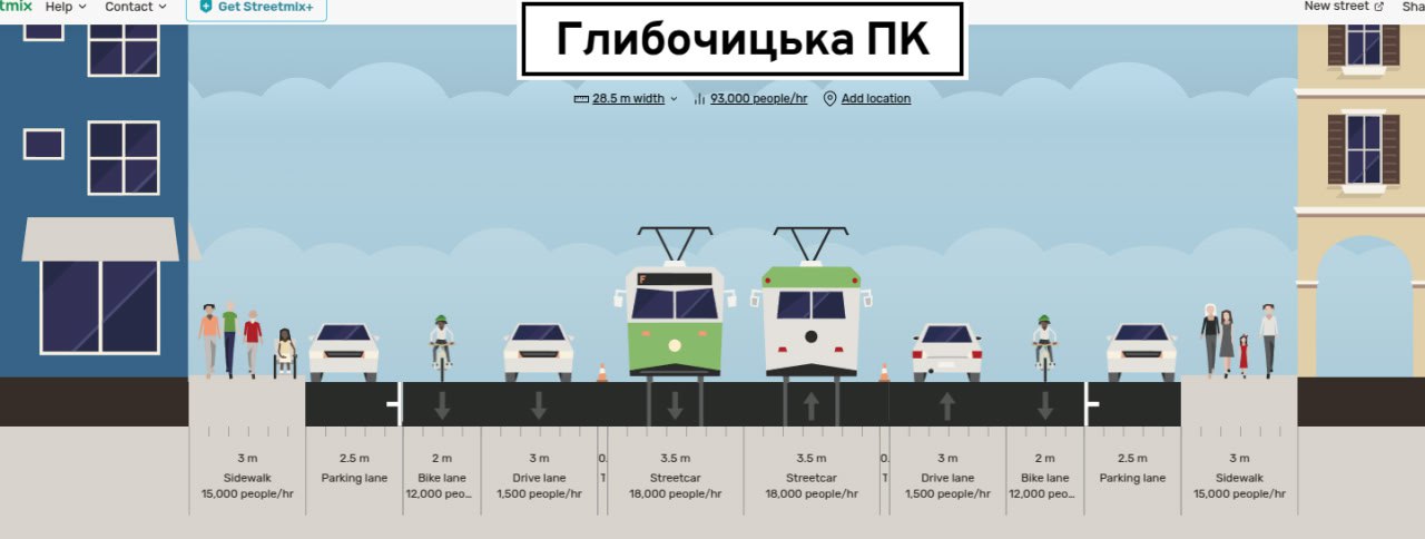 - зменшити надлишкову ширину смуг, облаштувавши нові паркомісця або односторонні велосипедні смуги. Адже Глибочицька є частиною магістрального веломаршруту “Солом’янка — Поділ”;