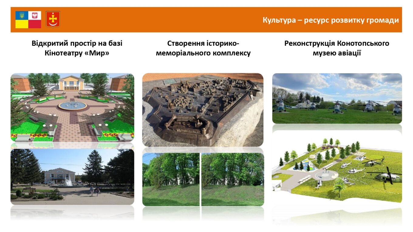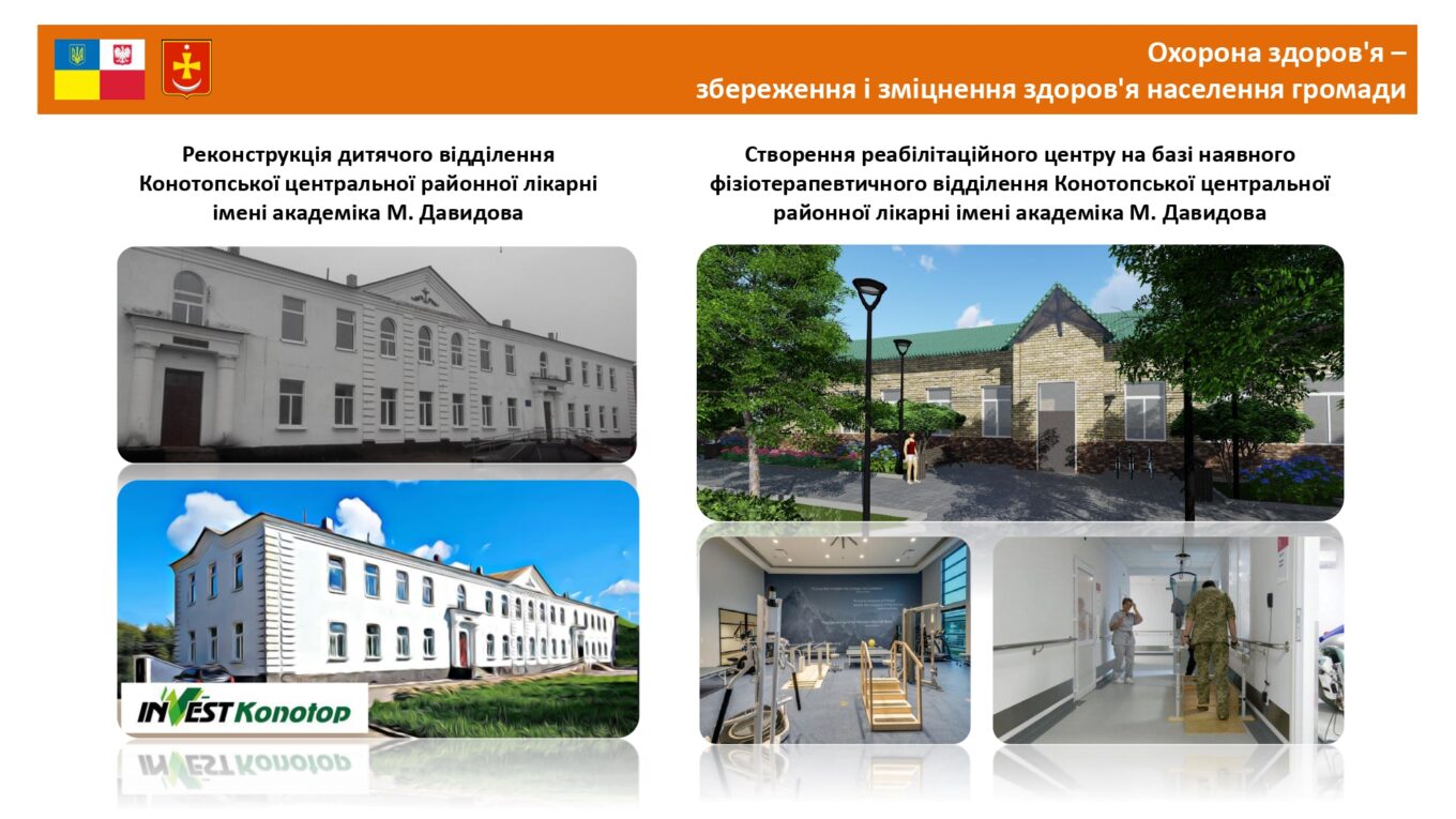 Як пише Цукр, у Конотопській громаді планують створити ветеранський простір, молодіжний центр і реабілітаційний центр у центральній районній лікарні. Ще хочуть побудувати регіональний полігон, спортивно-реабілітаційний центр і багатофункціональний спорткомплекс.