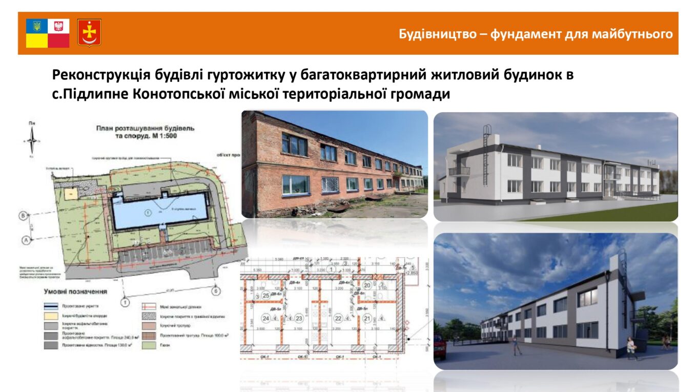 Також проведуть комплексну реконструкцію Привокзальної площі в Конотопі, щоб зробити її сучасним, доступним і кліматично адаптованим транспортно-пересадковим вузлом і публічним простором. Ще реконструюють стадіон “Юність” і дитяче відділення Конотопської центральної районної лікарні.