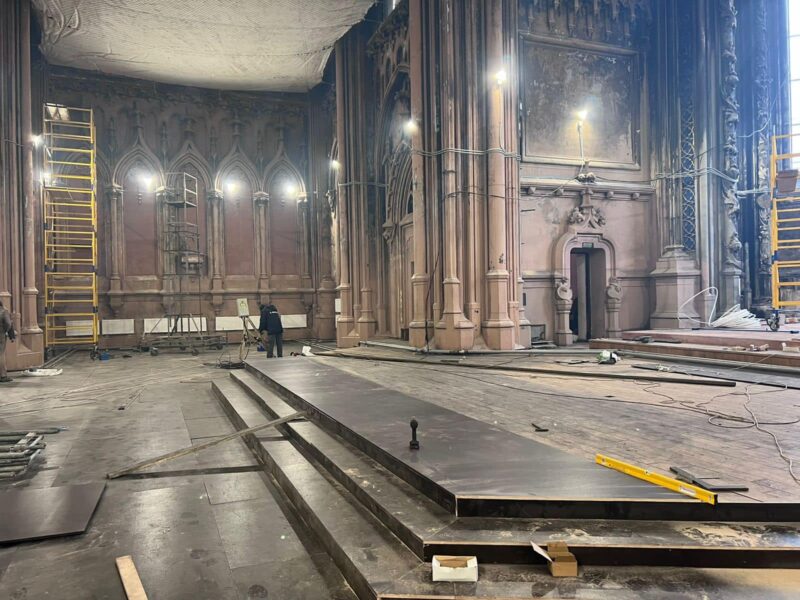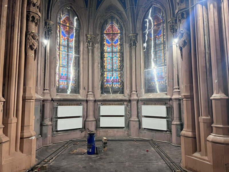 Наразі тут вдалось встановити нову систему освітлення та опалення, тимчасові віконні конструкції та захисні сітки, які оберігатимуть від падіння елементи декору зі стелі костелу.