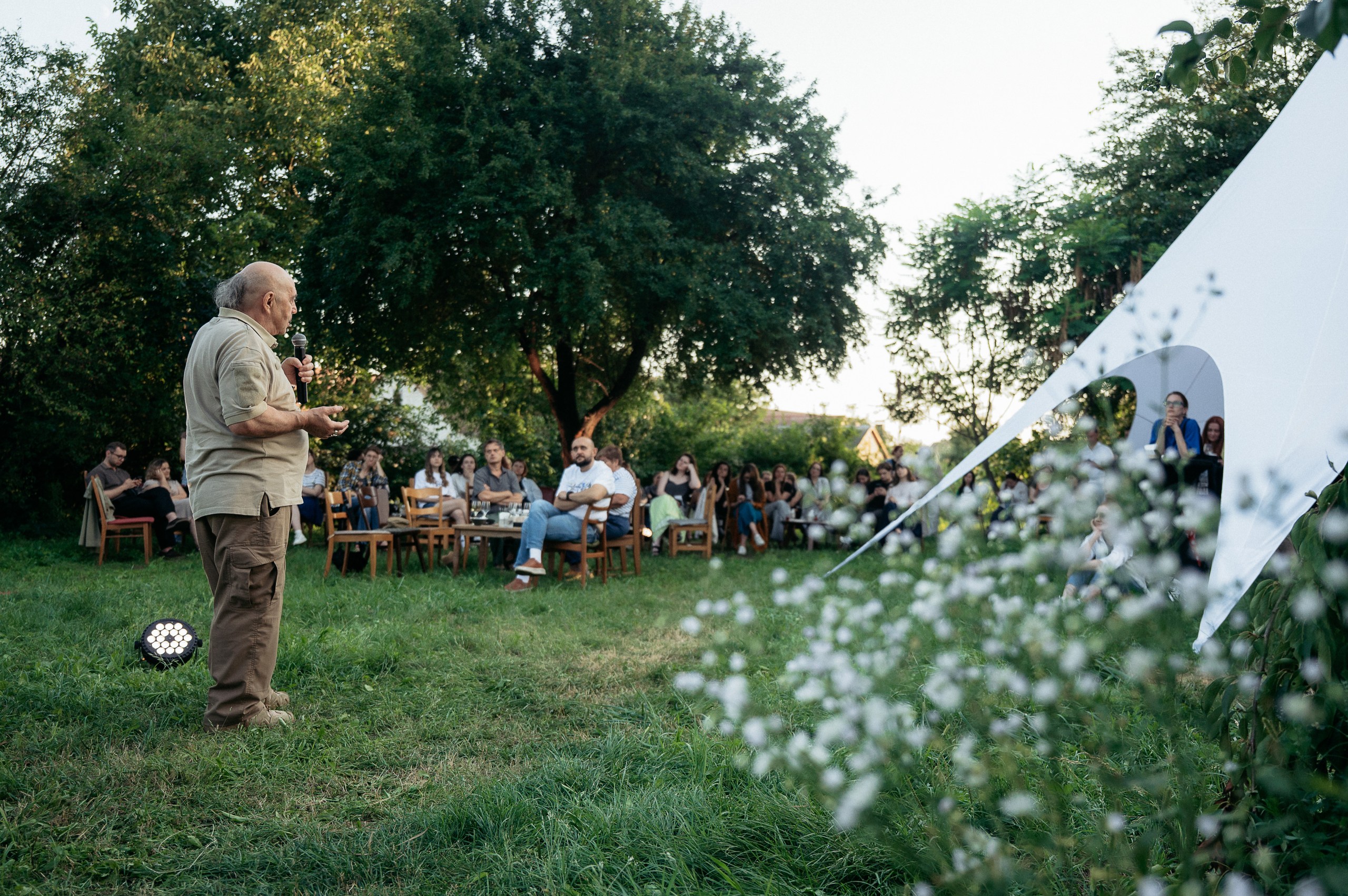 Елла Яцута, ідейниця проєкту, керівниця платформи «Алгоритм дій» і засновниця Літературної платформи «Фронтера»: «Сьогодні я розповідаю про мрію, яка стає реальністю. У 2020 ми гуляли з Олегом Покальчуком між деревами цього саду — біля родинного дому Покальчуків — і тоді вперше з’явилась ідея оживити цей простір. Відтоді минуло багато часу. Світ змінився, ми змінилися. Але сьогодні ми усі тут — поміж цих самих дерев. Я не знаю, чи простір уже говорить з вами. Але мені він каже: тут будуть відбуватись неймовірні речі.»